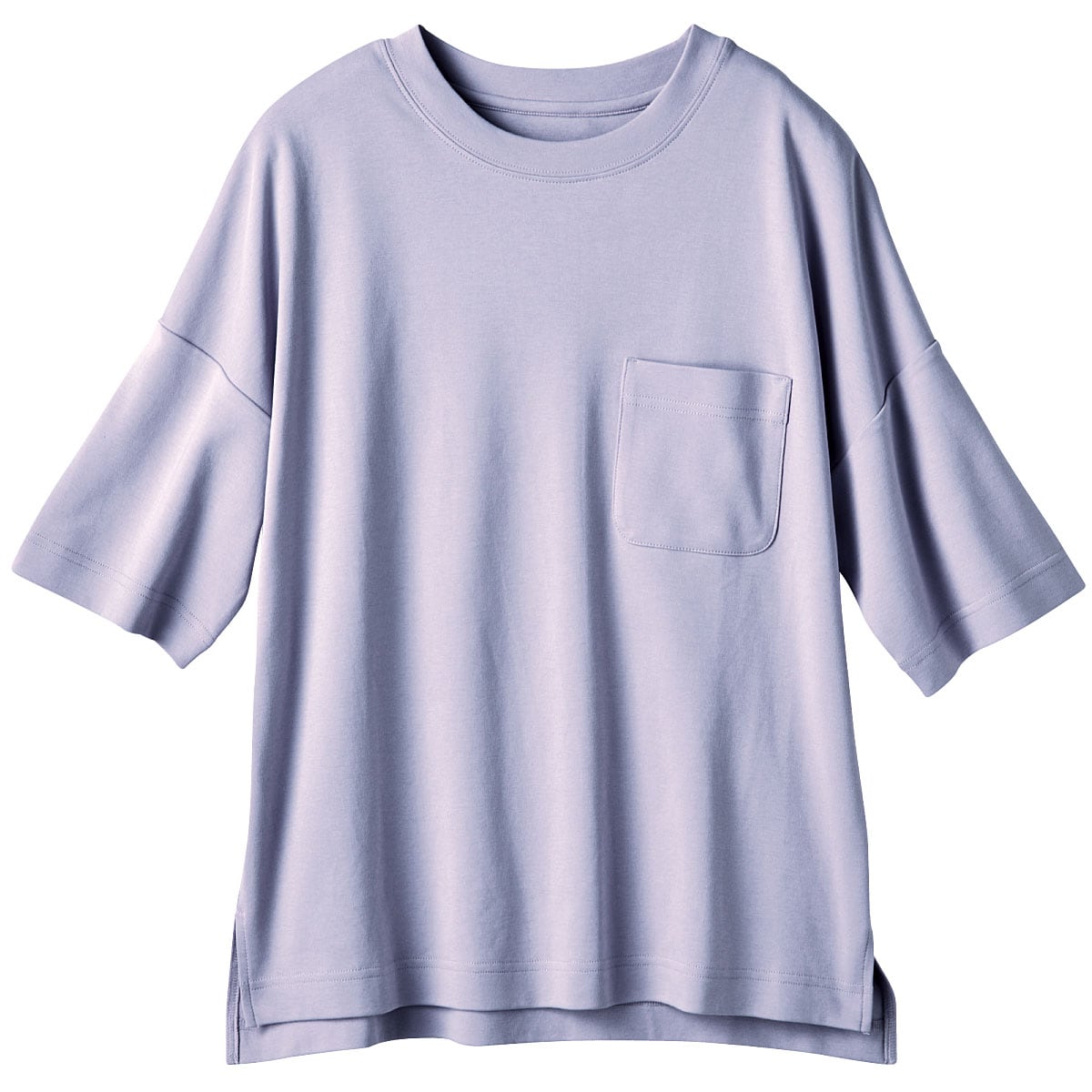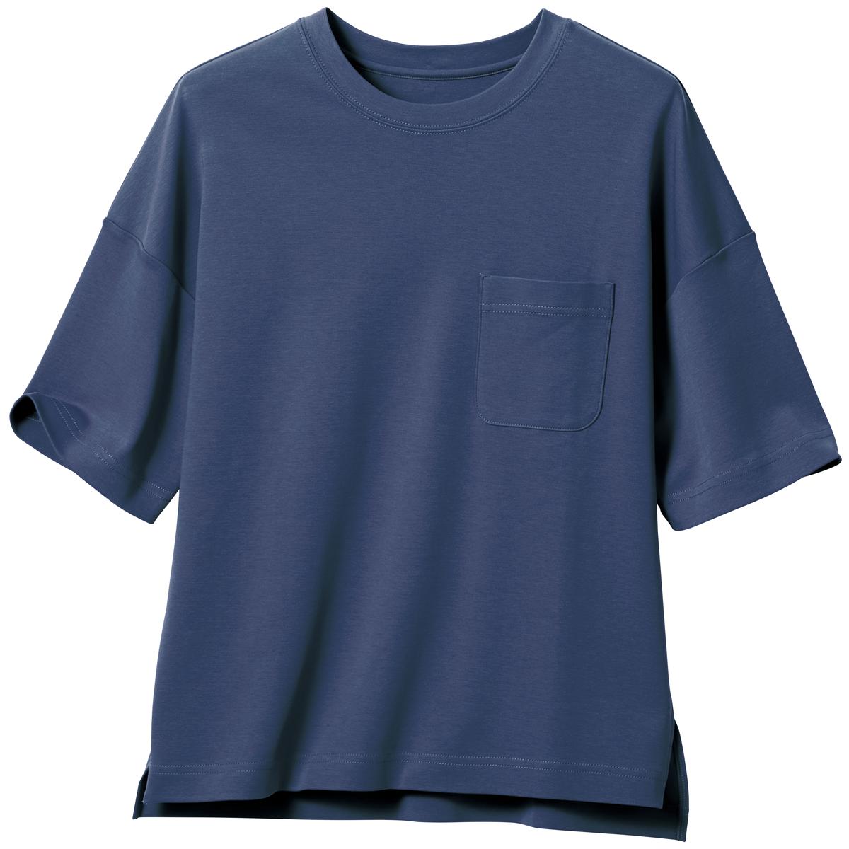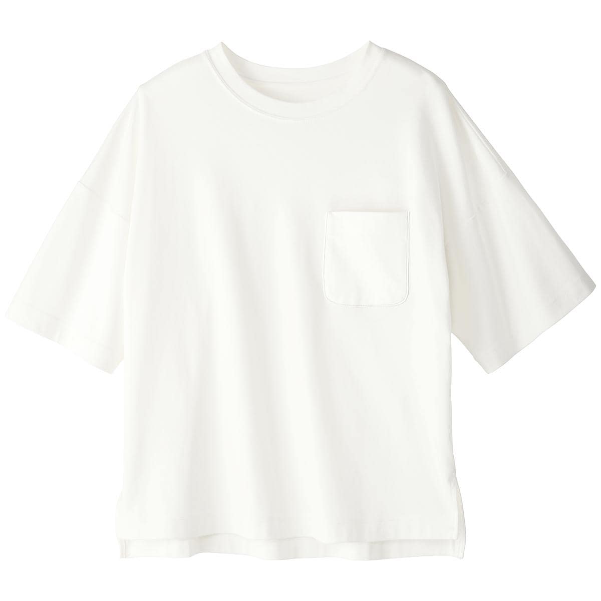 -お買い得ポイント-大人の女性の体型を計算しつくした絶妙なゆるシルエット。体のラインを拾いにくく、1枚で着こなしがサマになるクルーネックTシャツです。-デザイン-詰まった衿元と大きめポケットがメンズライクな雰囲気を、ドロップショルダーや両サイドのスリットがフェミニンな今どき感を演出します。袖をロールアップすると旬のスタイルに。-素材特徴-肌触りがなめらかな綿100%の生地を使い、程よく伸びもあって着る人のボディラインをきれいに見せてくれます。
