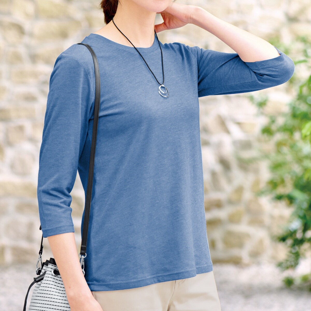 シンプルなデザインと、肌なじみのよい綿混素材で着心地もGood!気になる二の腕を隠しながら、手元がもたつかない袖丈はロングシーズン活躍します。