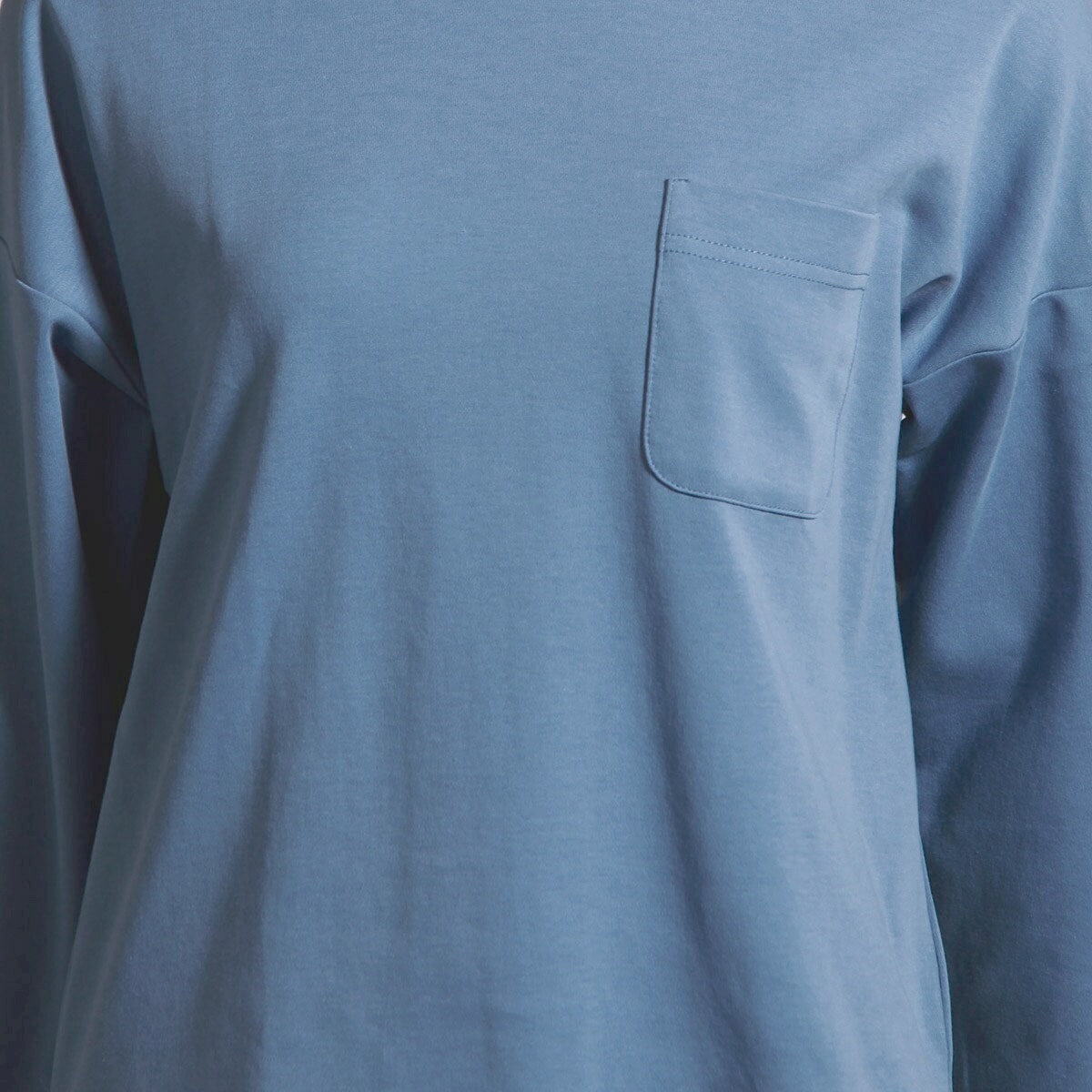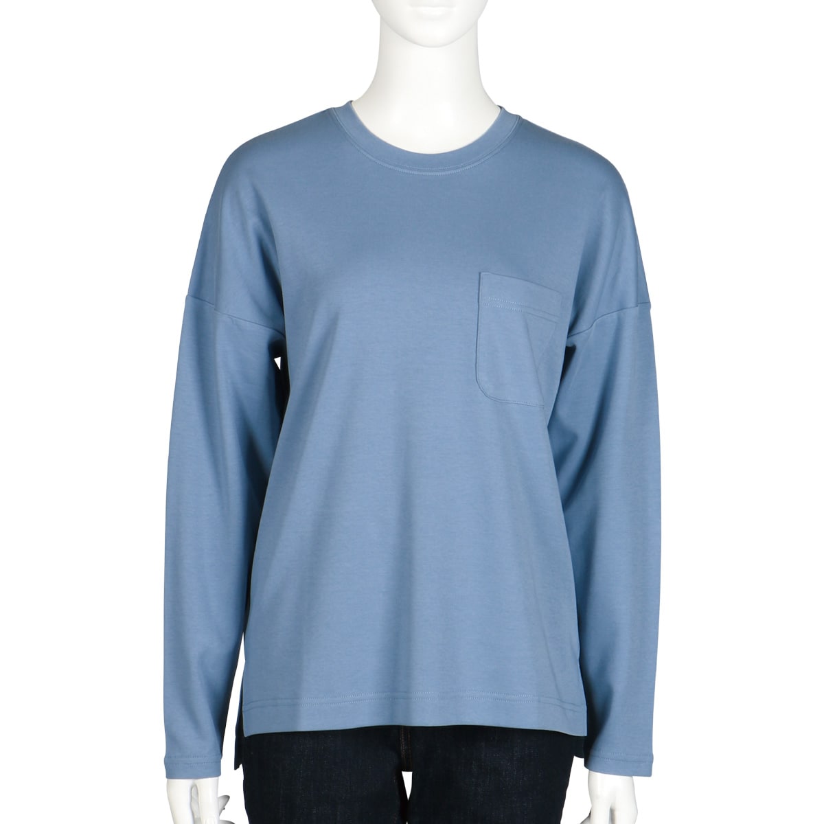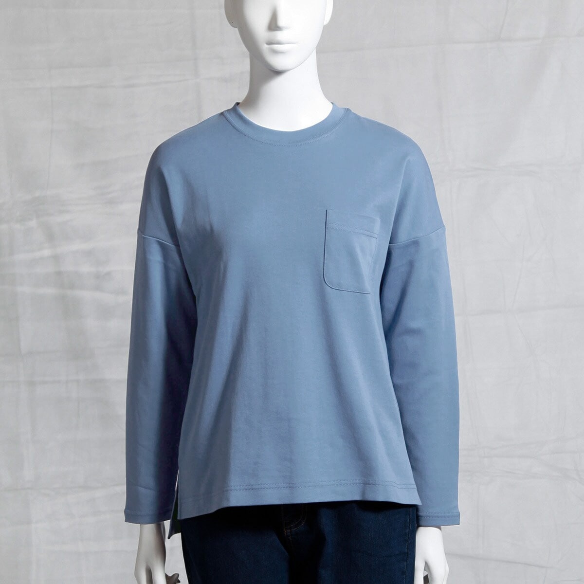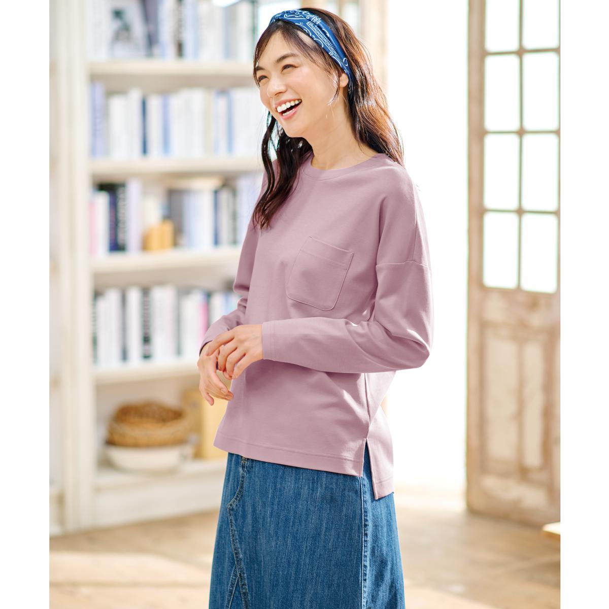 -お買い得ポイント-インナーにも使える長袖Tシャツです。両脇のスリットと長めの後ろ丈でさりげなく体型カバーができ、着やすさアップ。-デザイン-ベーシックなデザインに、胸ポケットがかわいらしさをプラス。ゆるっと着こなせるドロップショルダーや、抜け感をつくる脇スリット、前後差のある裾で、1枚でもこなれて見えます。-素材特徴-微光沢感と適度なハリのあるもっちり素材綿100%のやさしい肌ざわり、伸縮性があるので着脱もラク