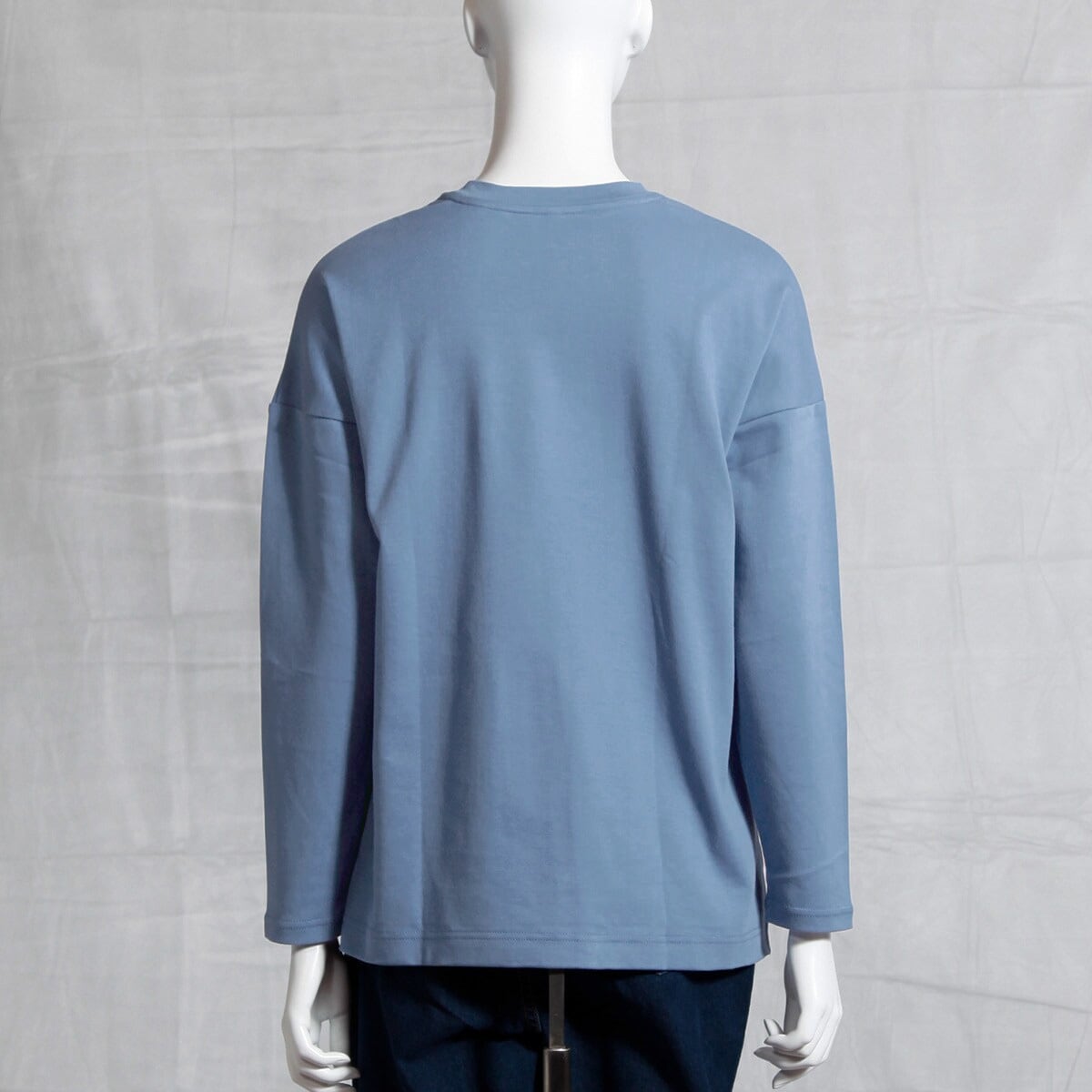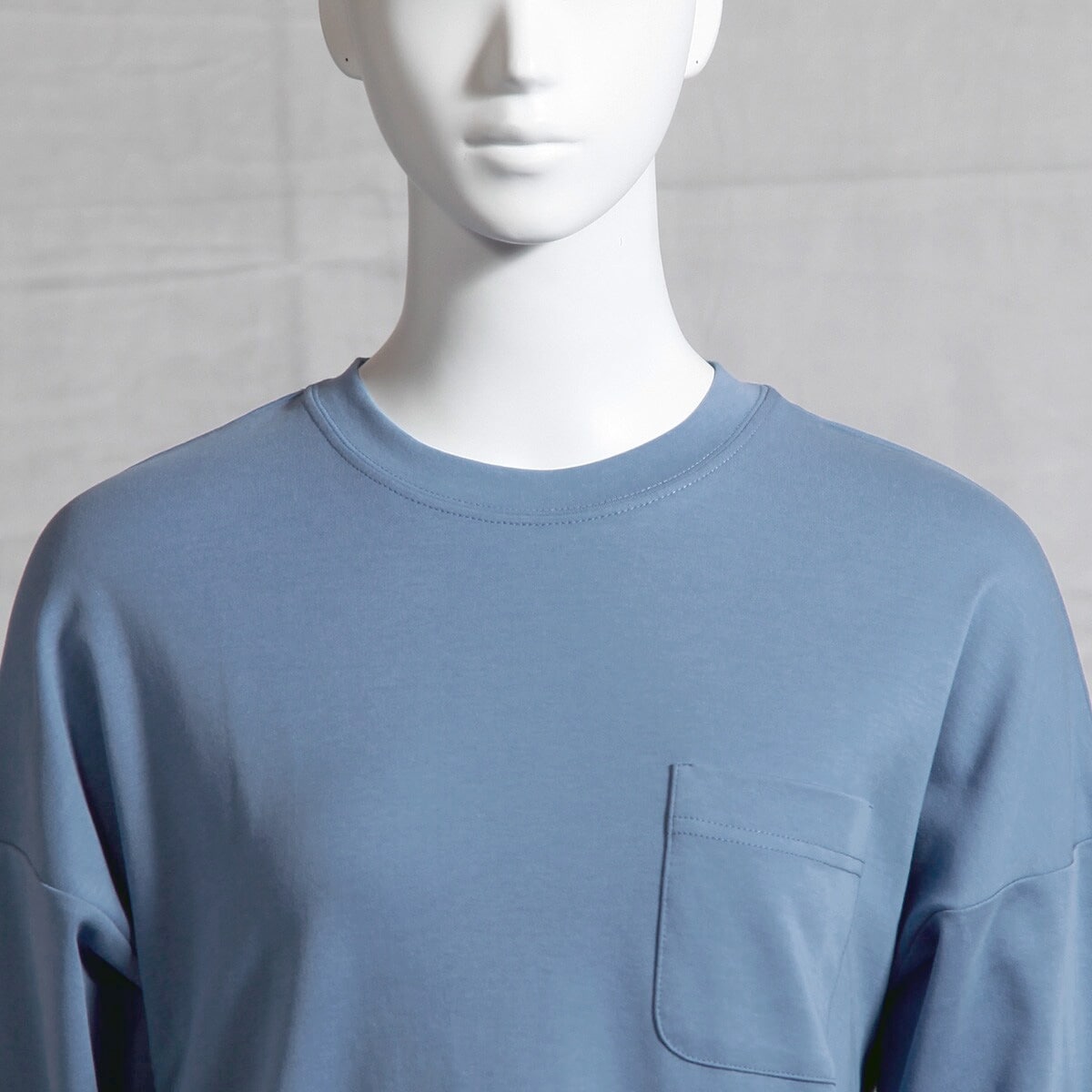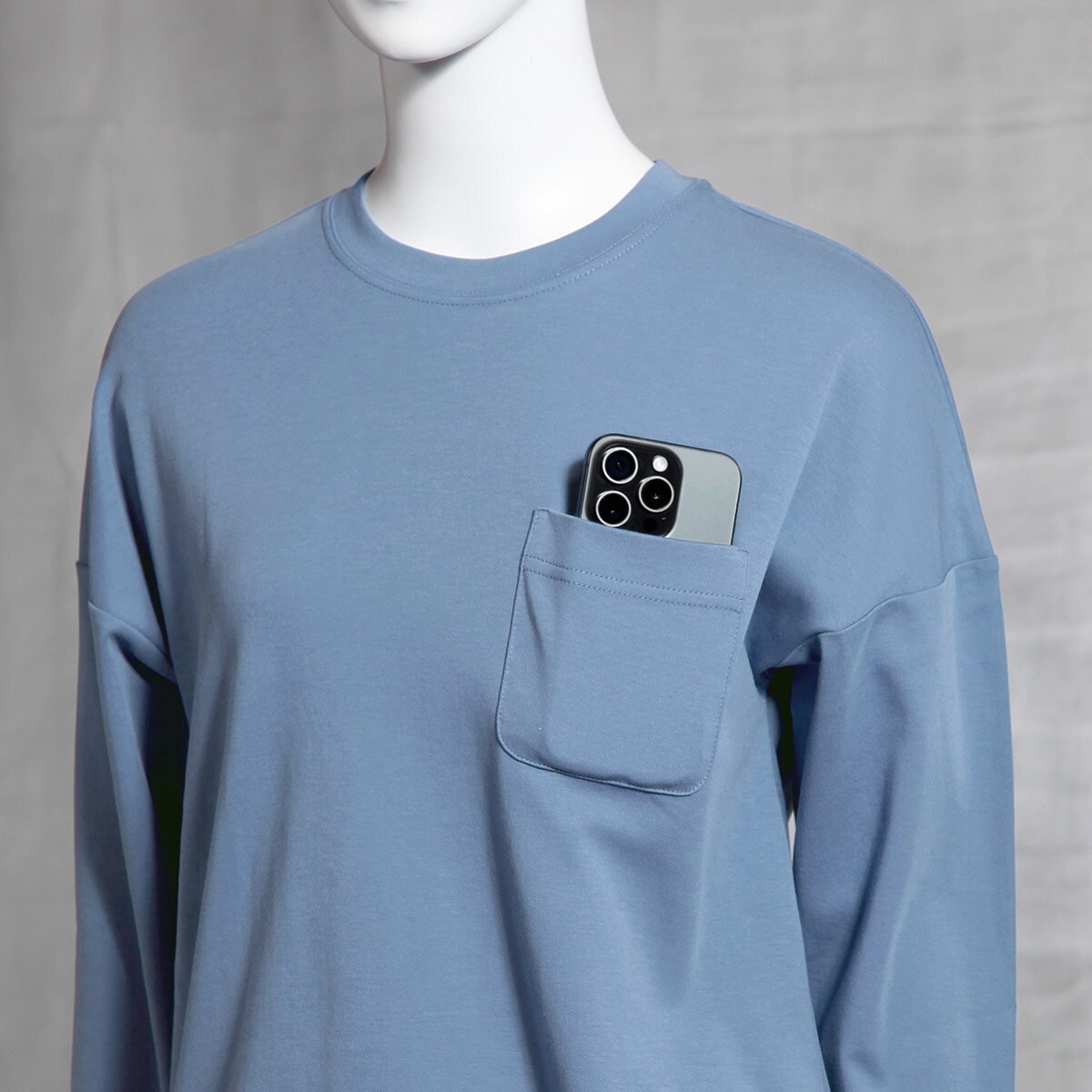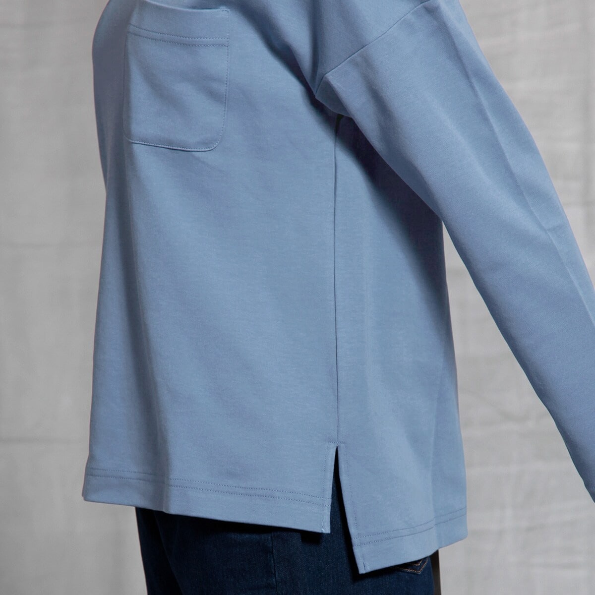 -お買い得ポイント-インナーにも使える長袖Tシャツです。両脇のスリットと長めの後ろ丈でさりげなく体型カバーができ、着やすさアップ。-デザイン-ベーシックなデザインに、胸ポケットがかわいらしさをプラス。ゆるっと着こなせるドロップショルダーや、抜け感をつくる脇スリット、前後差のある裾で、1枚でもこなれて見えます。-素材特徴-微光沢感と適度なハリのあるもっちり素材綿100%のやさしい肌ざわり、伸縮性があるので着脱もラク