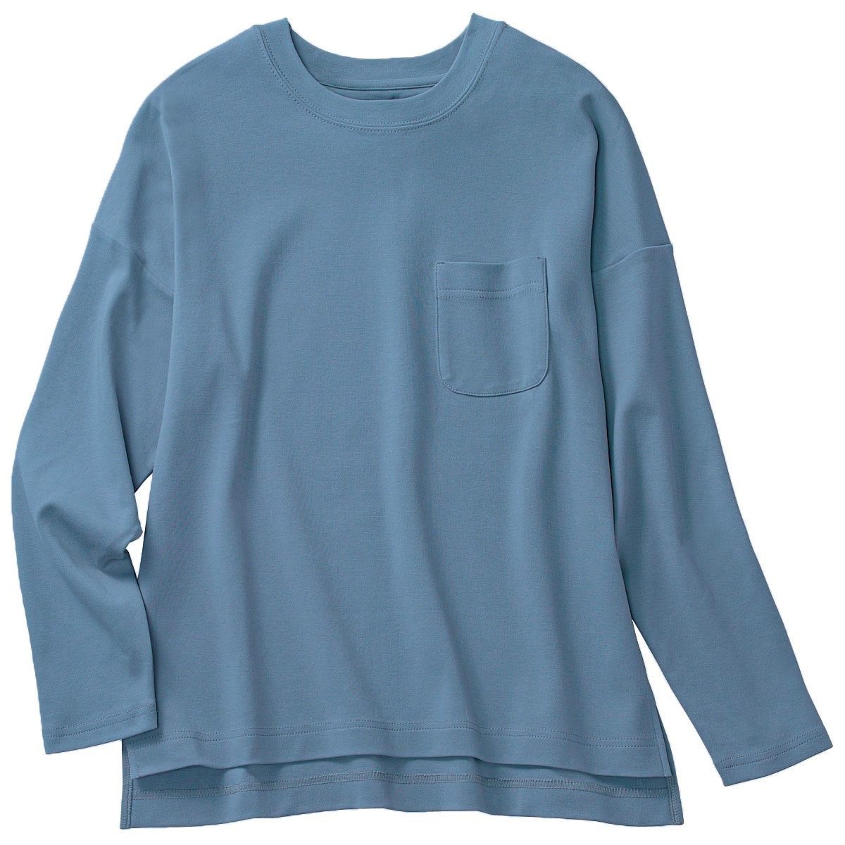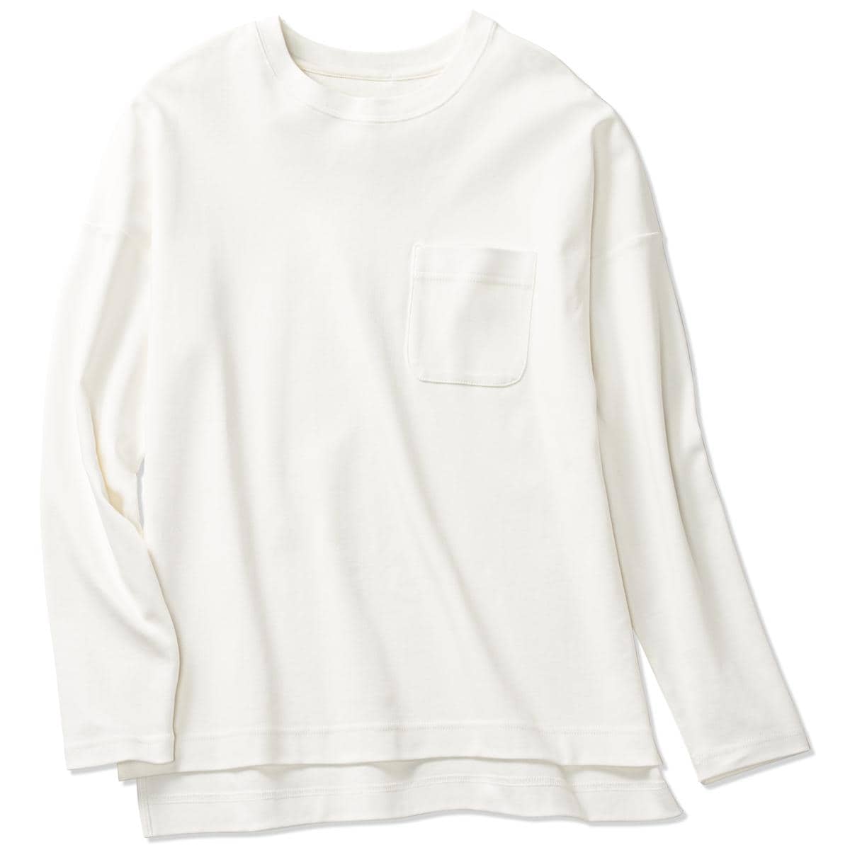 もっちり肉厚ながら伸縮性と程よい光沢感がある素材を使用し、しなやかな肌ざわりで快適な着心地。胸ポケット付きのベーシックなデザインながら、ゆるっと着こなせるドロップショルダーや、抜け感をつくる脇スリットと前後差のある裾で、1枚でもこなれて見えます。洗濯機でも手軽に洗えて、今から春本番まで長く活躍してくれます。