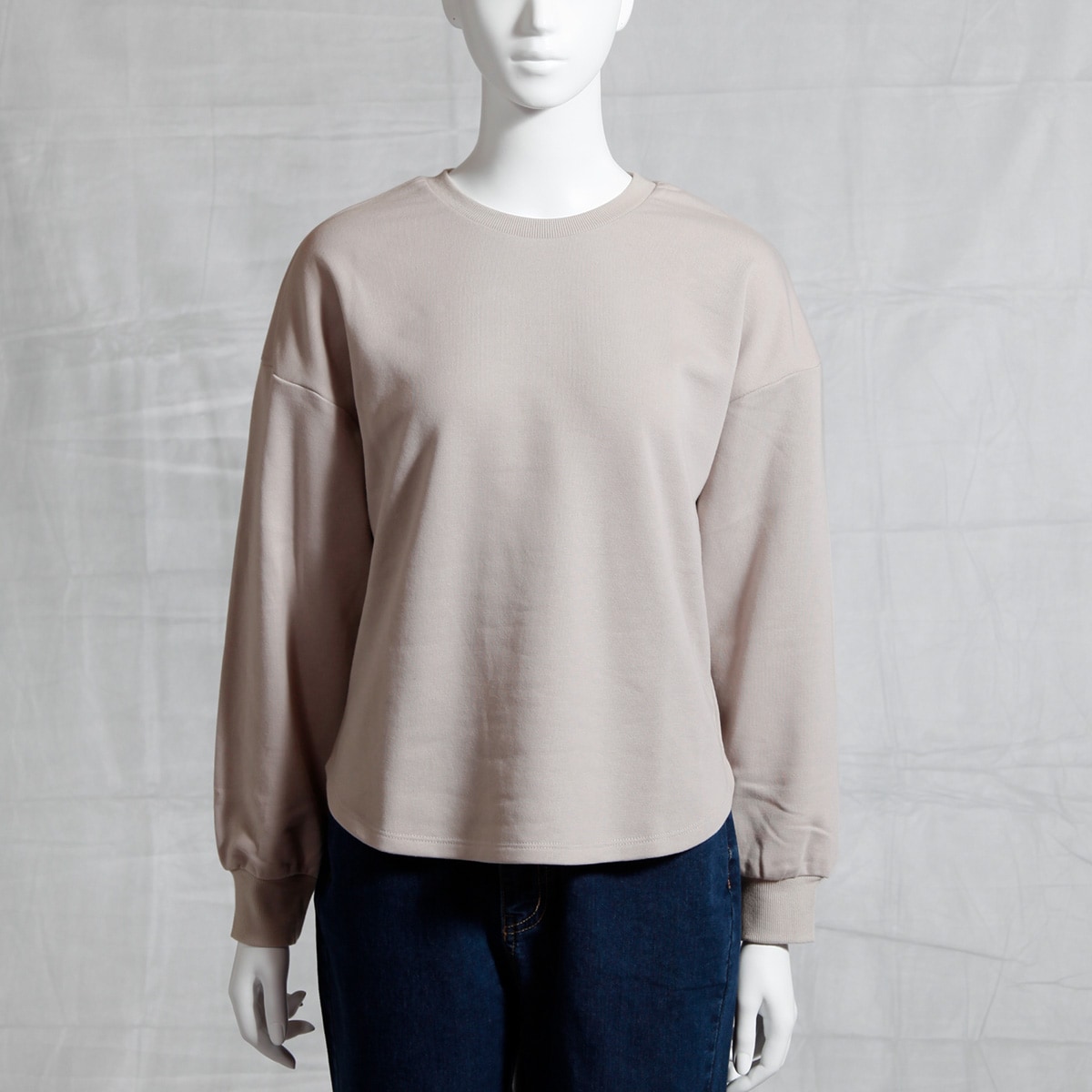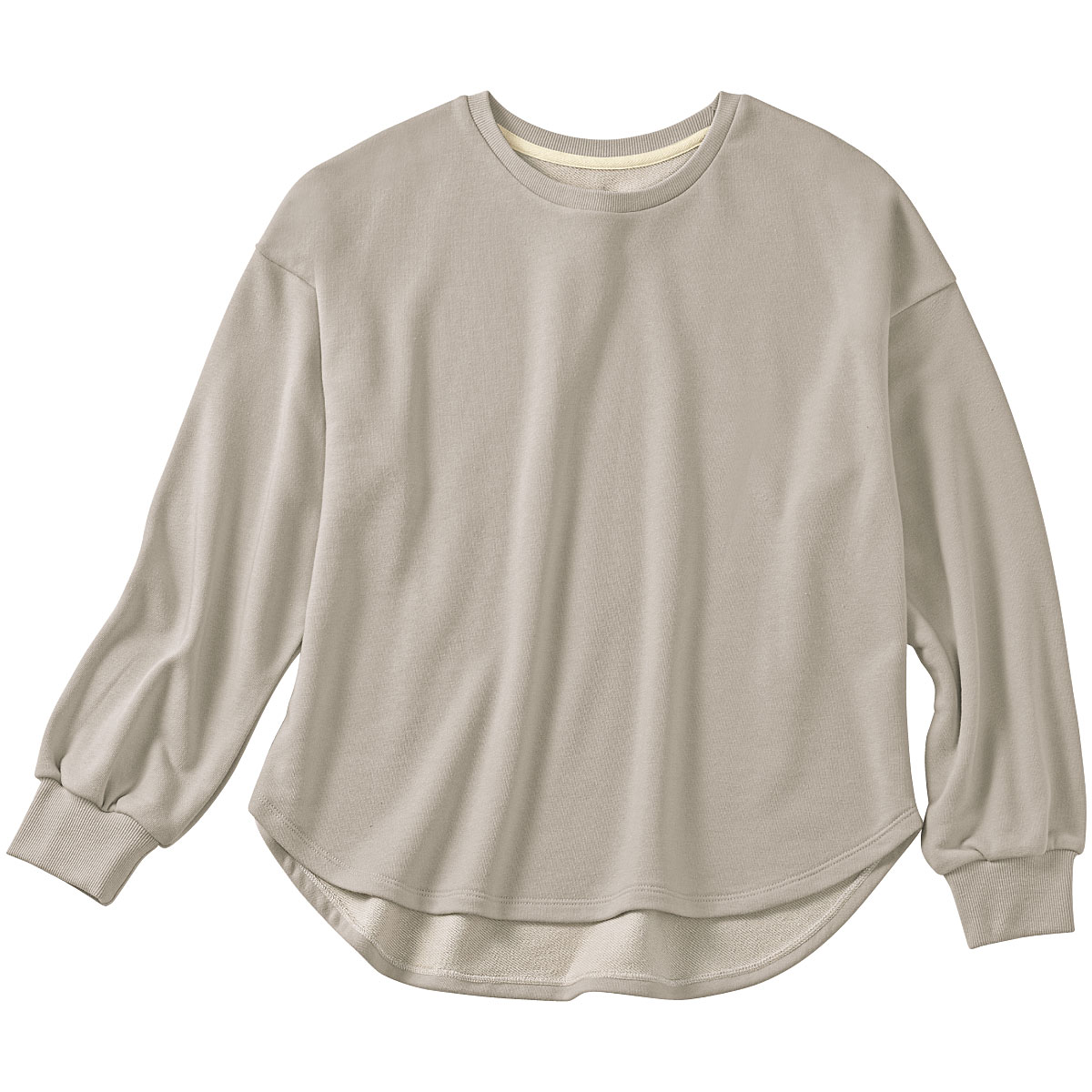 -お買い得ポイント-お出かけにもリラックスタイムにも着回し上手なおしゃれスウェット。肌寒くなるこれからのシーズンに、大活躍すること間違いなしの1枚です。-デザイン-ドロップショルダーと前後後オのあるラウンド裾がこなれ感を演出。少しふんわりとした袖で優しい印象に。-素材特徴-肌側は綿100%パイルでふんわり。毎日をほっと過ごせるおしゃれなスウェット。