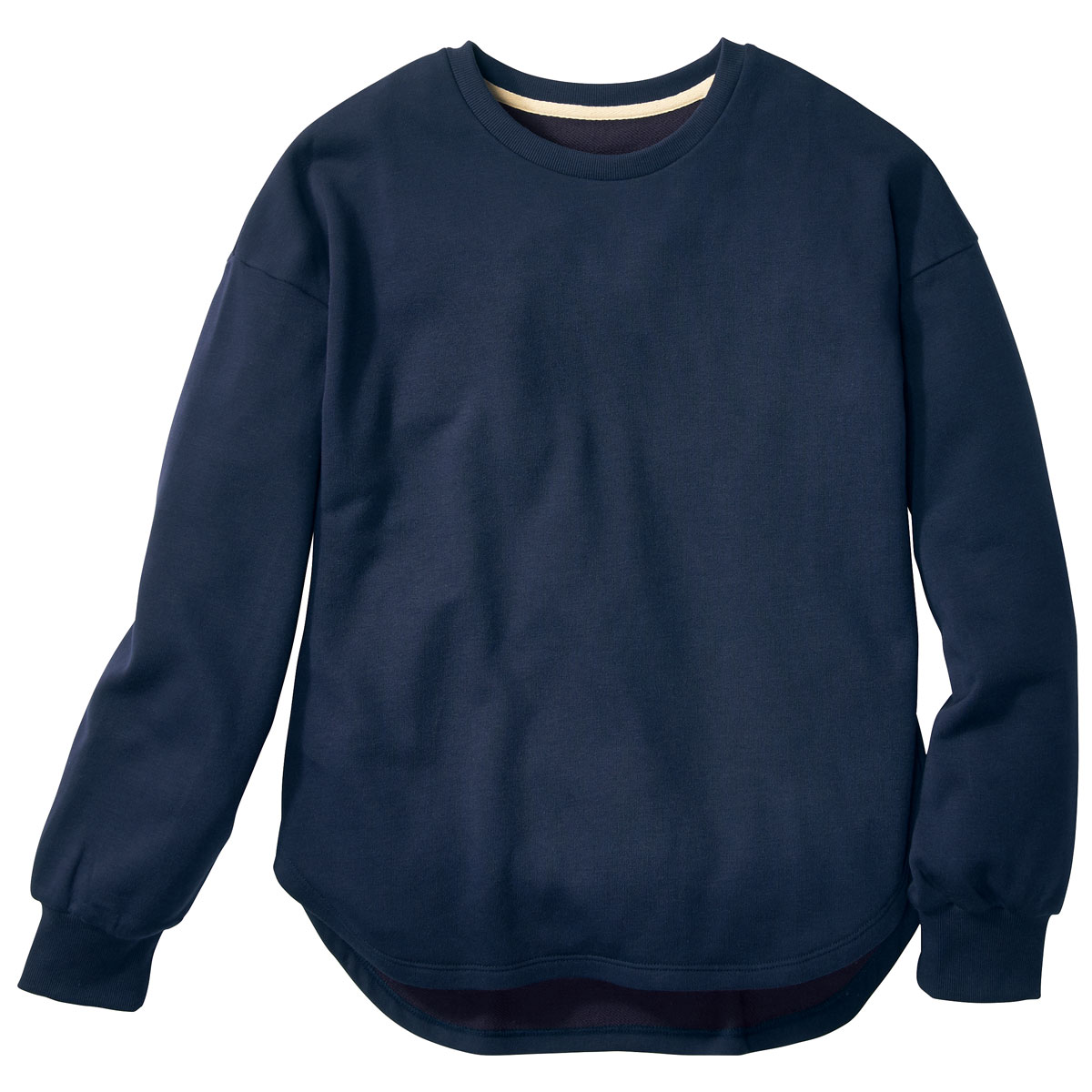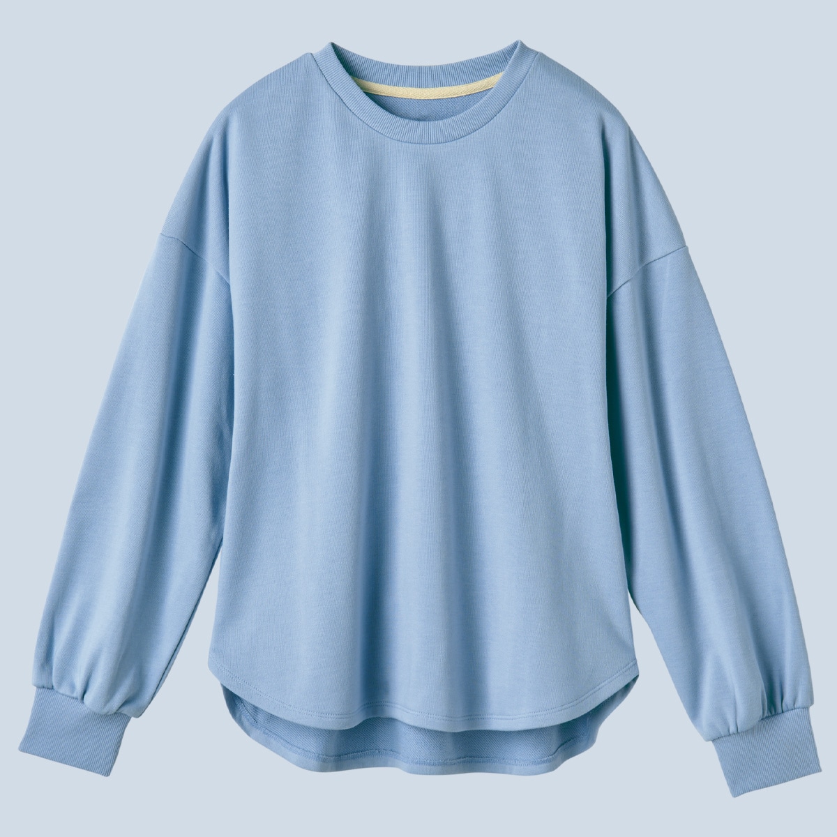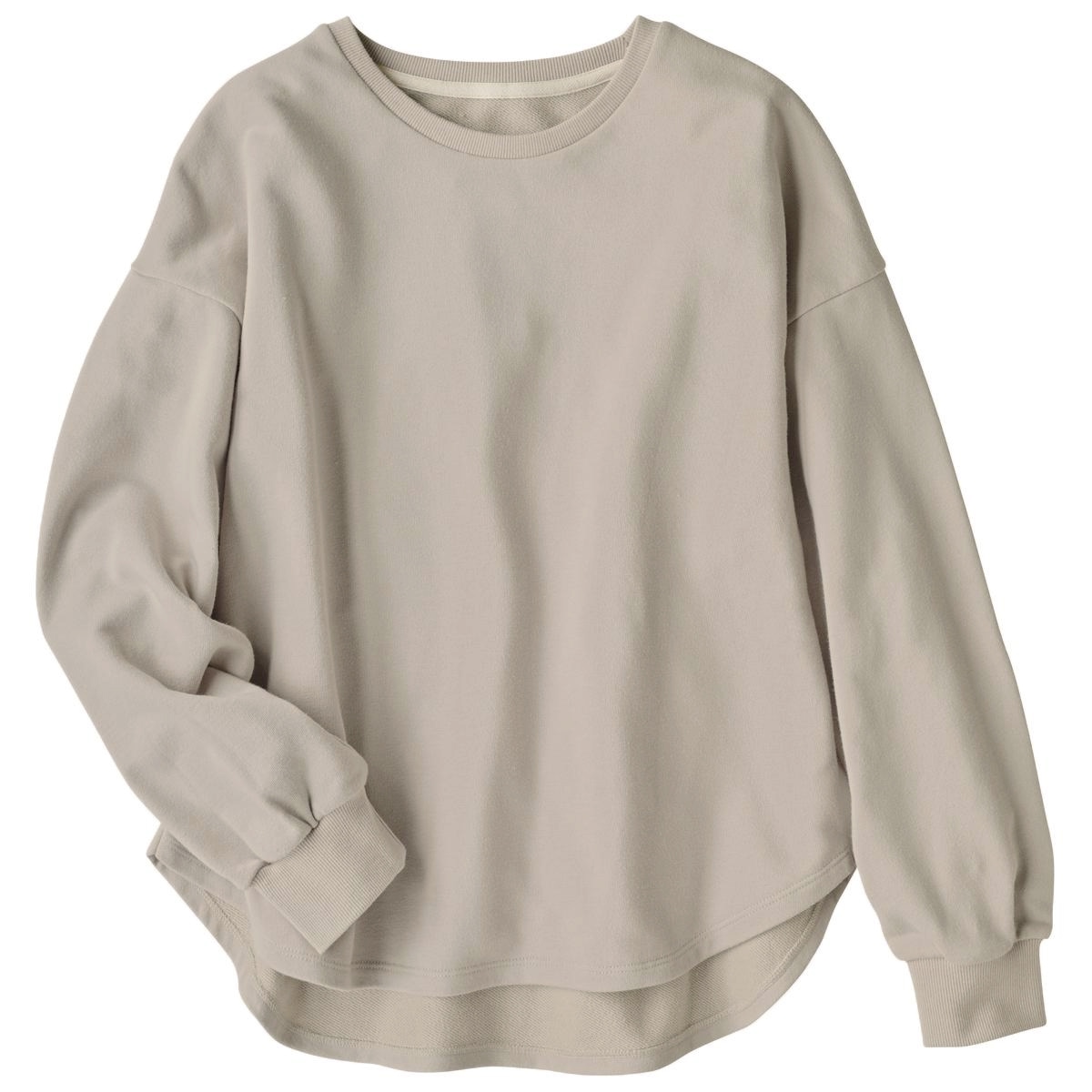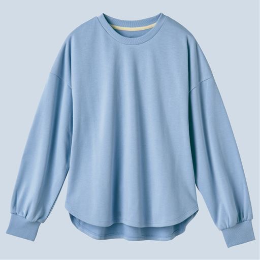 -お買い得ポイント-ドロップショルダーのやわらかなシルエットで、愛らしさと着やすさを兼ね備えた1枚。-デザイン-ややふんわりとした袖がデザインポイント。前後差のあるラウンド裾は、ウエストアウトでも決まります!後ろ衿ぐり部分は綾テープで縫い目を隠した仕様でチクチク感を軽減。-素材特徴-裏側はふんわりとしたパイル状の綿100%で肌あたりがよく、表側は発色がよくカジュアルすぎない綿混素材です。