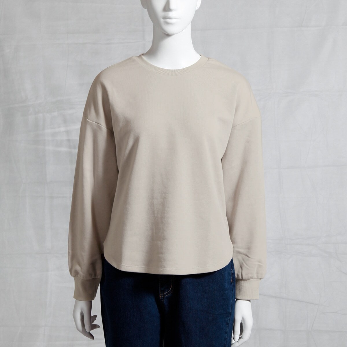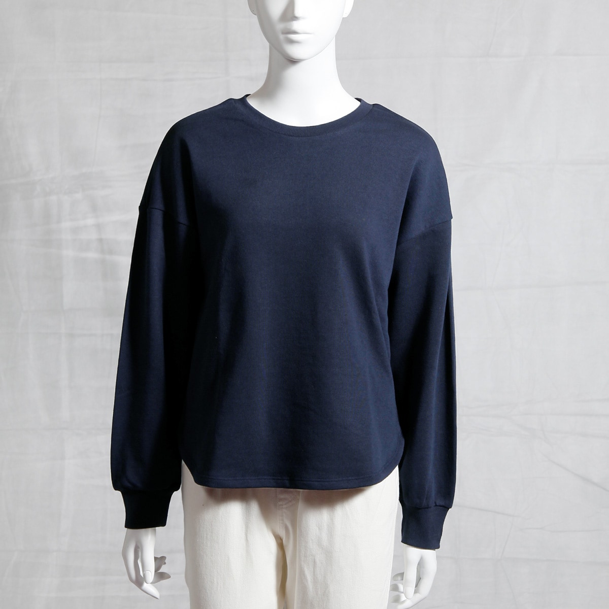 ドロップショルダーの優しいシルエットと前後差のあるラウンド裾で1枚でも着やすいデザイン。