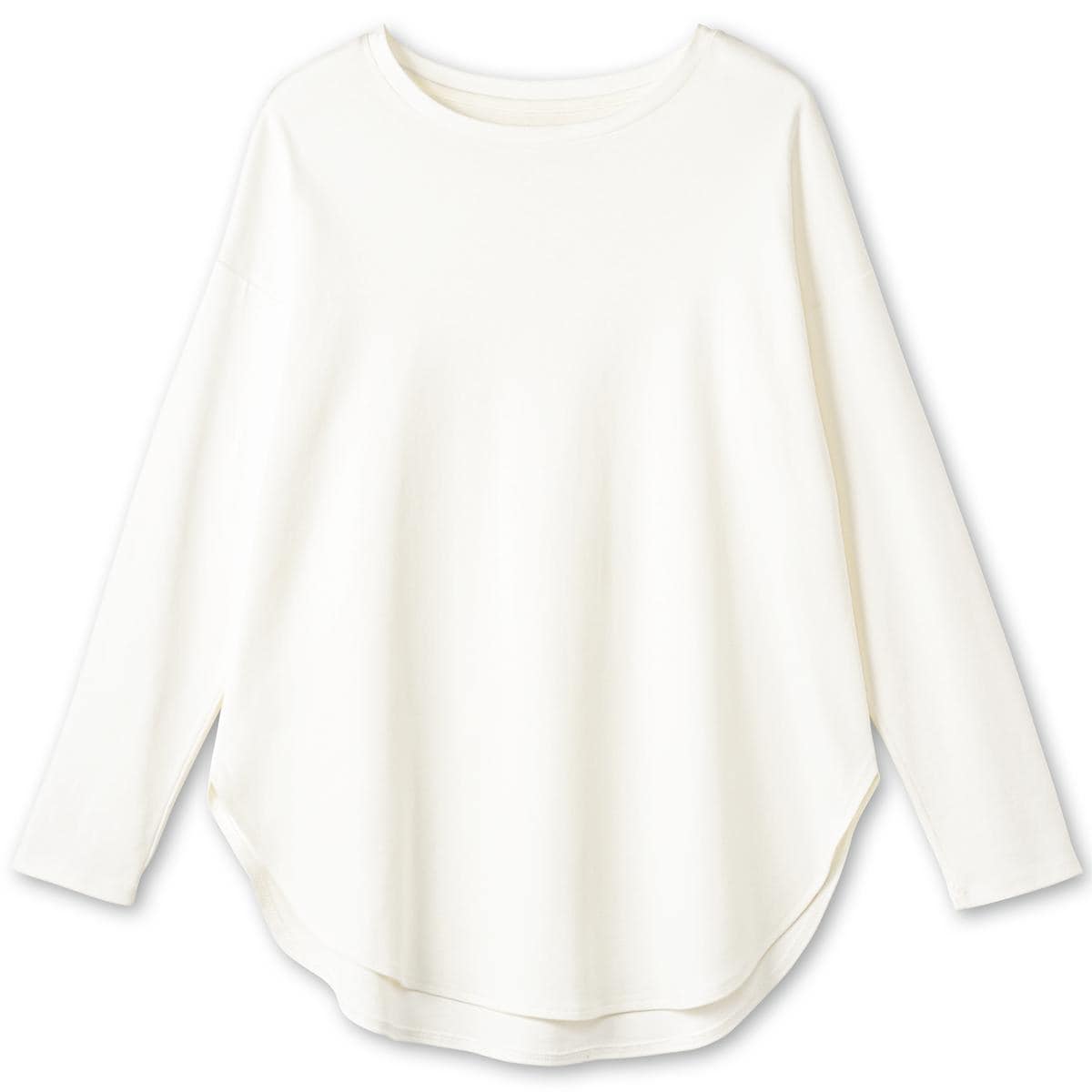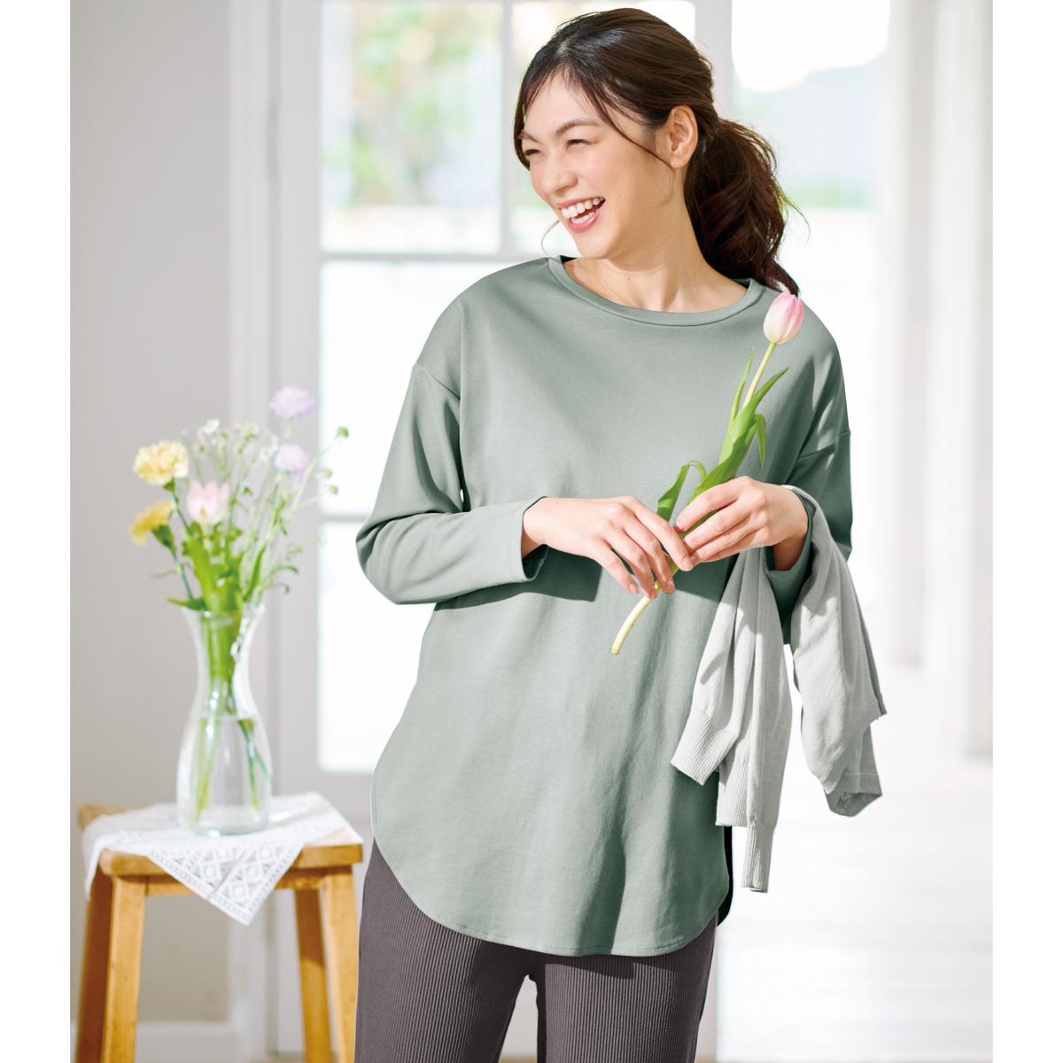 -お買い得ポイント-レイヤードスタイルにも映える深めのラウンドヘム-デザイン-前後差のあるラウンドヘムと詰まりすぎないラウンドネックで、色々なアイテムと合わせやすい!ゆったりデザインで、1枚でも重ね着のインナーとしても着まわし力ばっちり◎-素材特徴-ふんわり厚手のスムース生地微光沢の綿100%でなめらかな着心地です。