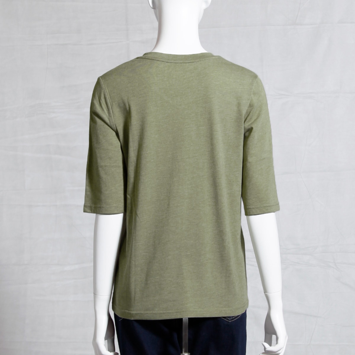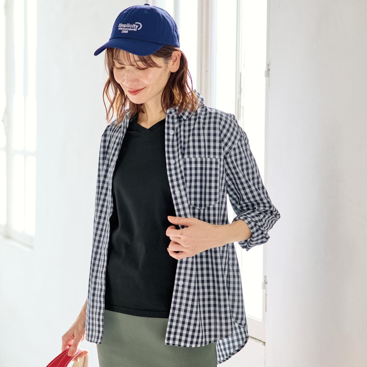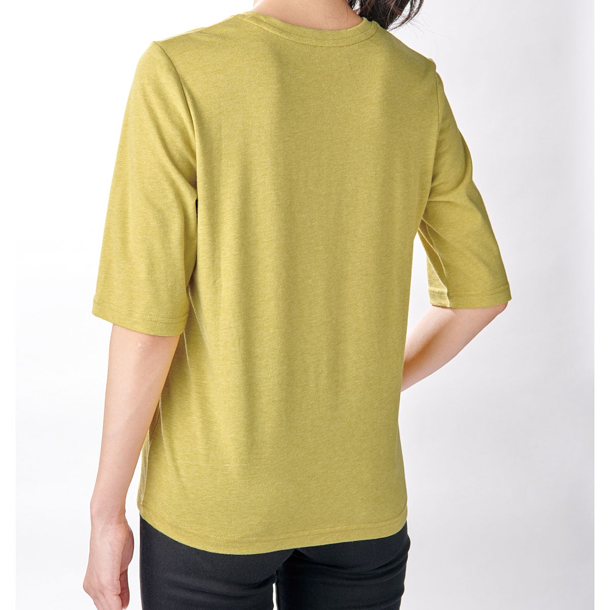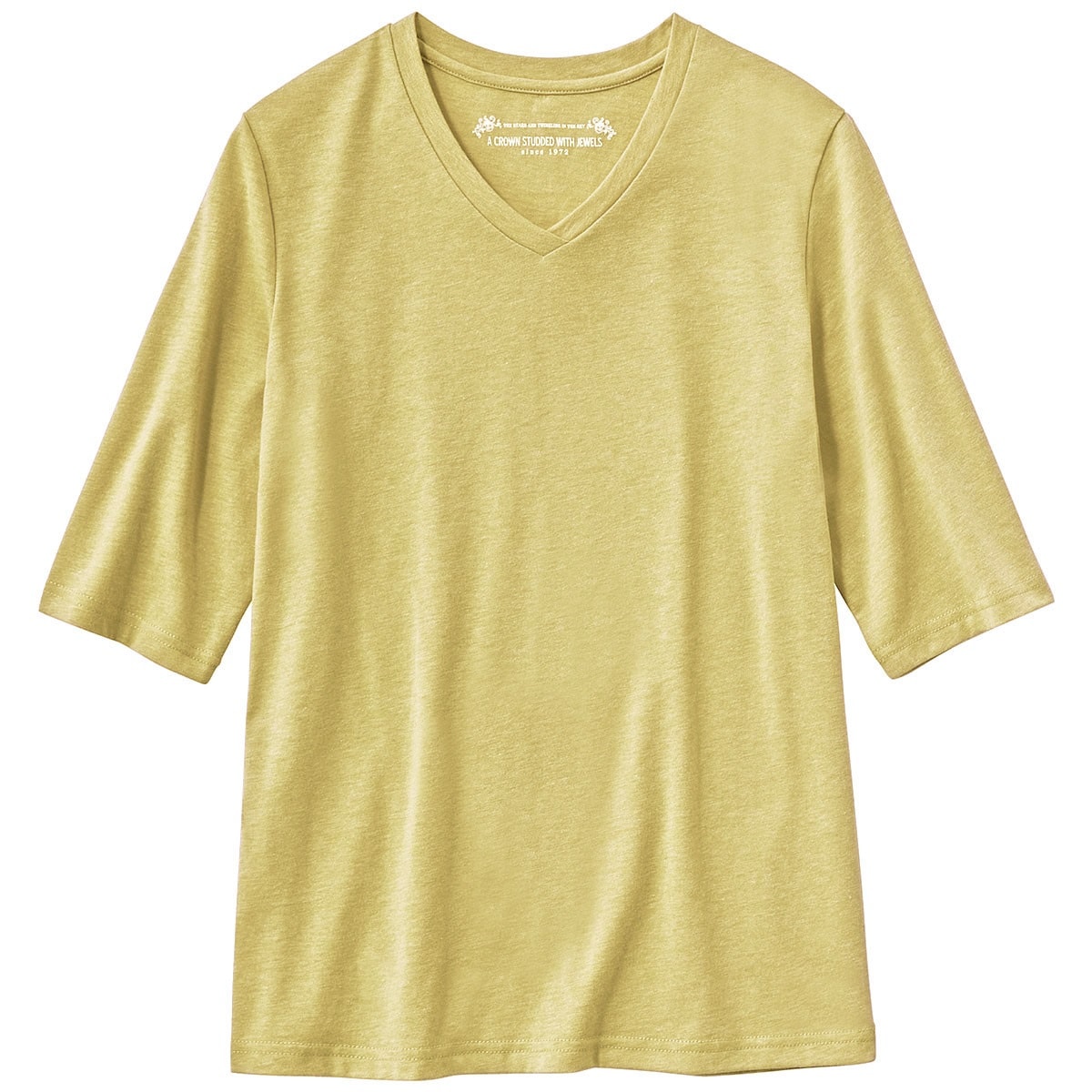 -お買い得ポイント-シンプルなVネックTシャツは何枚あっても使えるアイテム☆-デザイン-デコルテをきれいに見せるネックラインで自信が持てるTシャツです。後ろ衿ぐりはパイピングでしっかり補強。1枚で着ても、重ね着をしてもオシャレ♪5分袖が二の腕をカバーし、カジュアルになりすぎないので大人の女性にもおすすめ。-素材特徴-肌なじみのよい優しい着心地の綿混素材を使用しています。