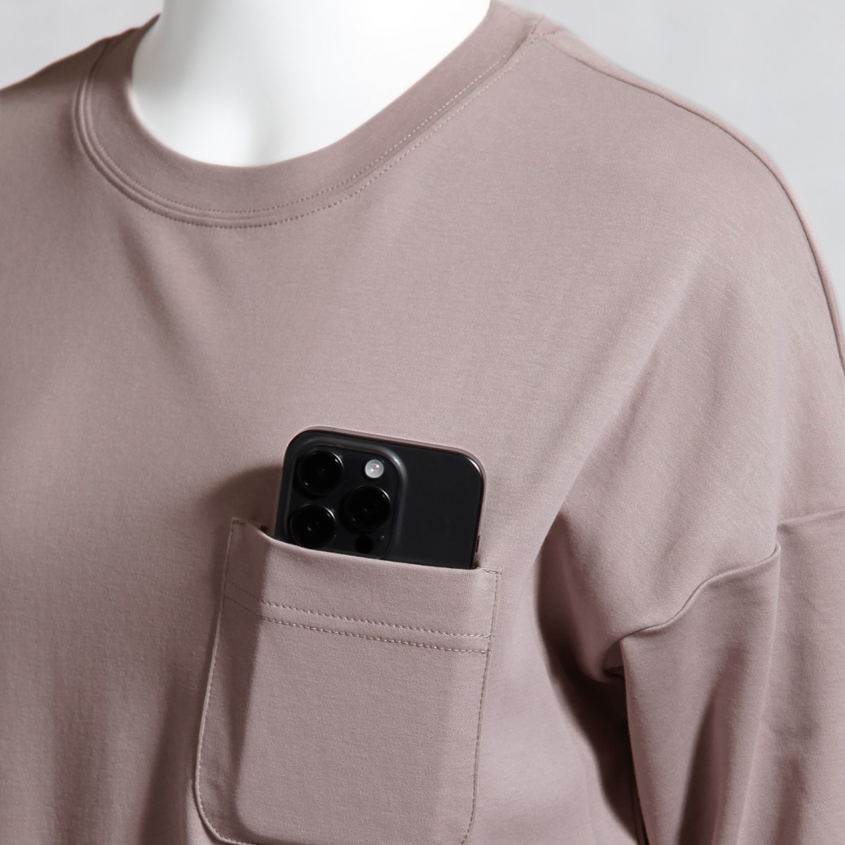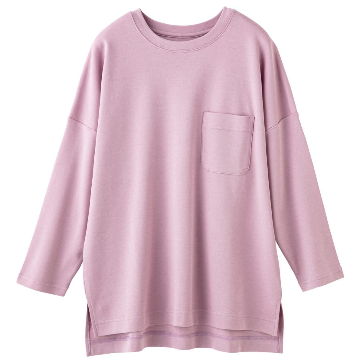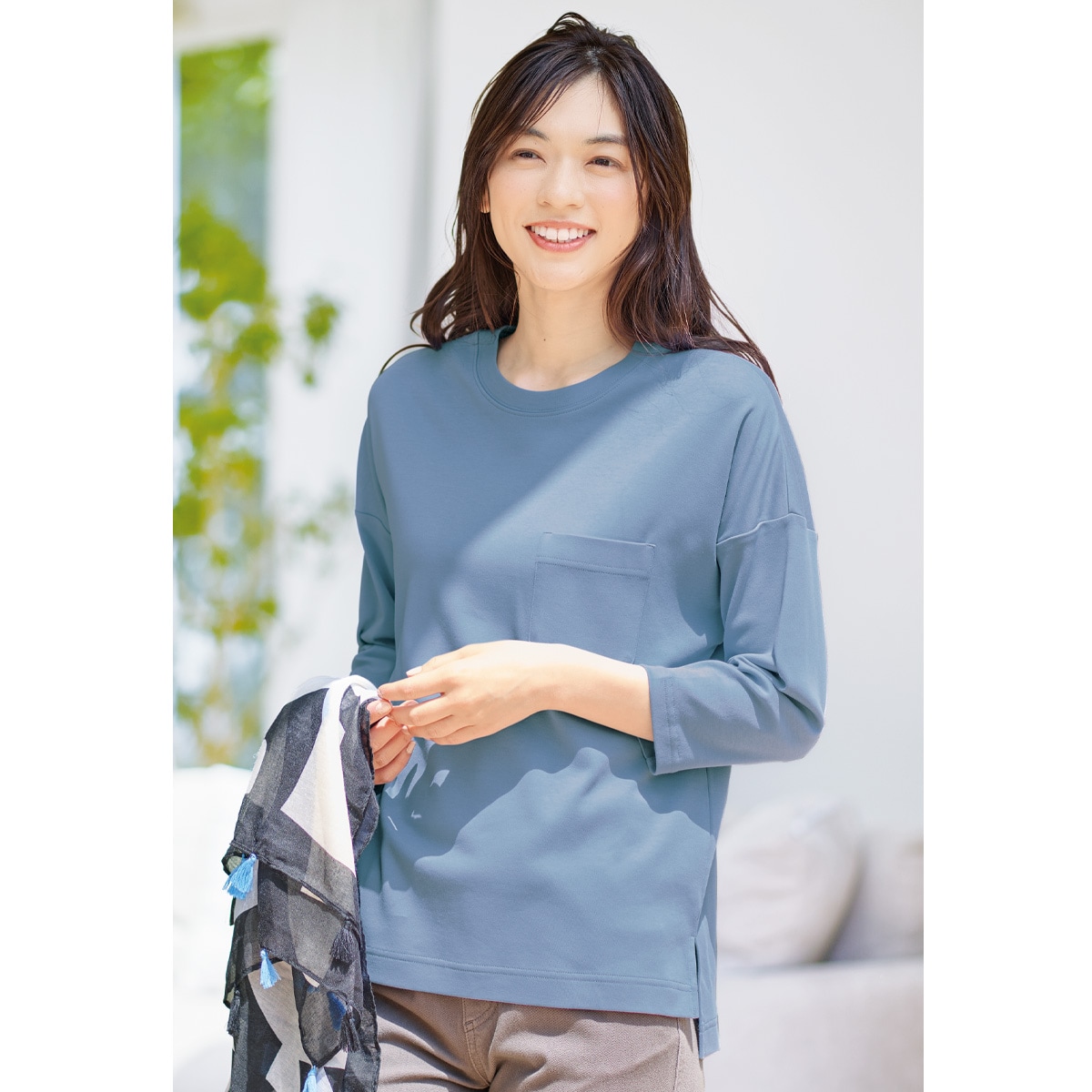 -お買い得ポイント-季節の変わり目に重宝する7分袖Tシャツ。両脇のスリットと長めの後ろ丈でさりげなく体型カバーができ、着やすさアップ。-デザイン-ベーシックなデザインに、胸ポケットがかわいらしさをプラス。ゆるっと着こなせるドロップショルダーや、抜け感をつくる脇スリット、前後差のある裾で、1枚でもこなれて見えます。-素材特徴-微光沢感と適度なハリのあるもっちり素材綿100%のやさしい肌ざわり、伸縮性があるので着脱もラク