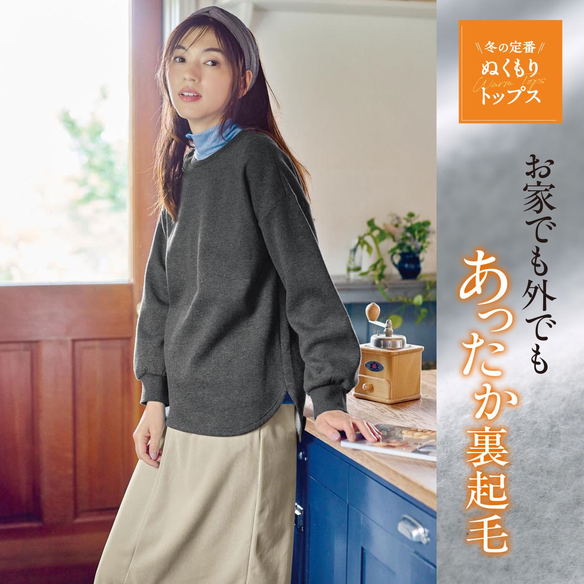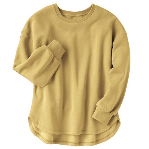 -お買い得ポイント-後ろ長めの丈感で腰まわりの体型カバーにお役立ち!1枚で決まるこなれトップス-デザイン-前後差のあるラウンドヘムがやさしい雰囲気を演出-素材特徴-軽くてやわらかな裏起毛空気を含んでふんわりあったか