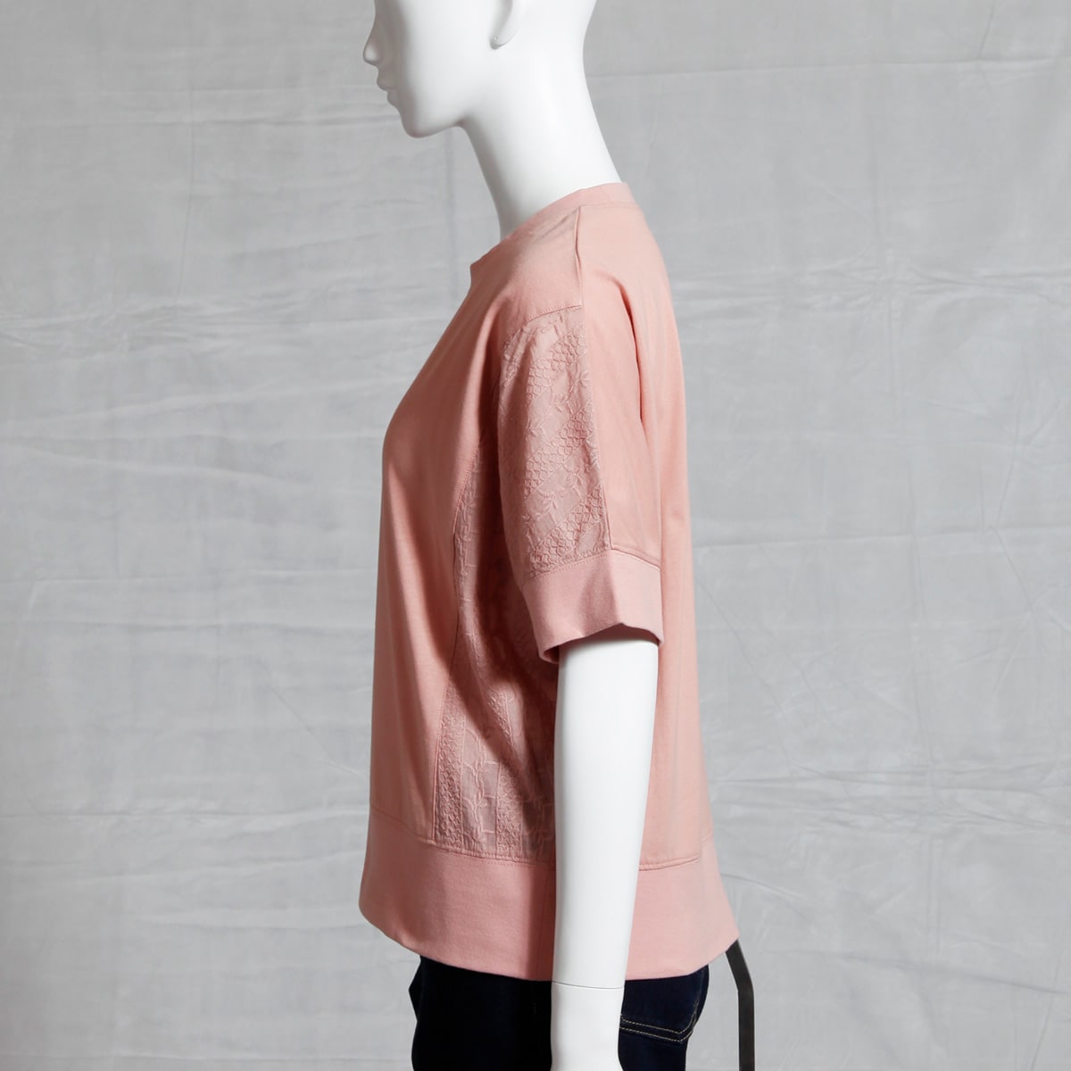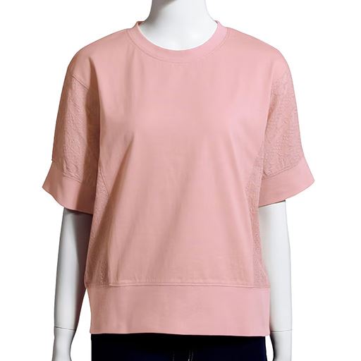 ーお得ポイントー袖や脇の華やかなレースが心躍る!ーデザインー袖から両脇にあしらった縦ライン状のレースが細見え効果を叶えます。ー素材特徴ー綿100%(リブ以外)で心地よい着心地