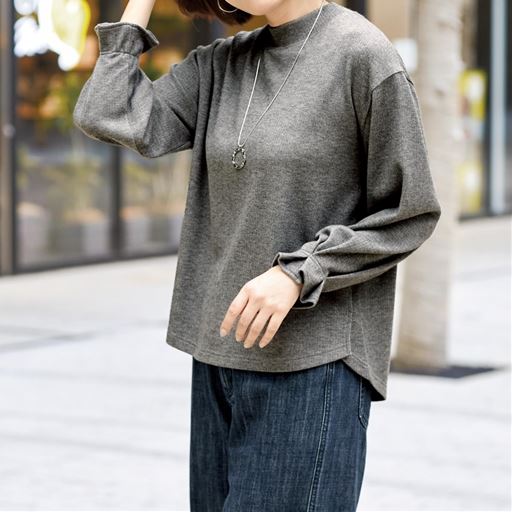 -お買い得ポイント-着回ししやすいベーシックデザインに、袖タックがちょいポイントで可憐な着こなしに。-デザインポイント-ふんわりしたフリル袖口はタック&部分ゴム使いで締め付けもソフト-素材特徴-うっすらと起毛して温かみのある細リブのプルオーバー