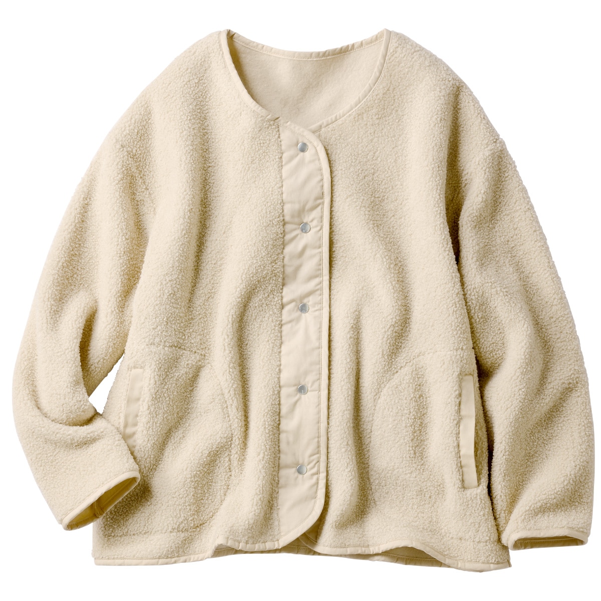-お買い得ポイント-厚手のトップスの上にも羽織れるゆったりサイズ衿元をすっきり見せるノーカラー仕様-デザイン-パイピングデザインが今どきなボアカーディガンコートのインナーとしても着られる軽い着心地で着こなしの幅が広がります。-素材特徴-もこもこしすぎない程よいボリュームのふんわり軽いボア素材
