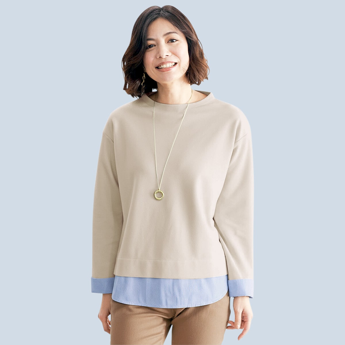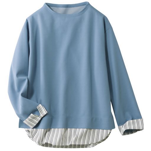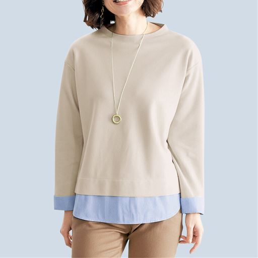 -お買い得ポイント-ストライプの布帛シャツとのレイヤードスタイルが1枚で完成。品よくきまる大人のキレイめカジュアルにぴったり。-デザイン-裾や折り返した袖口にストライプ柄の布帛をあしらって、一枚で重ね着風の着こなしに。モックネックですっきり美しい印象。-素材特徴-自宅の洗濯機で洗えて経済的!身生地はカットソー素材なのでラクな着心地