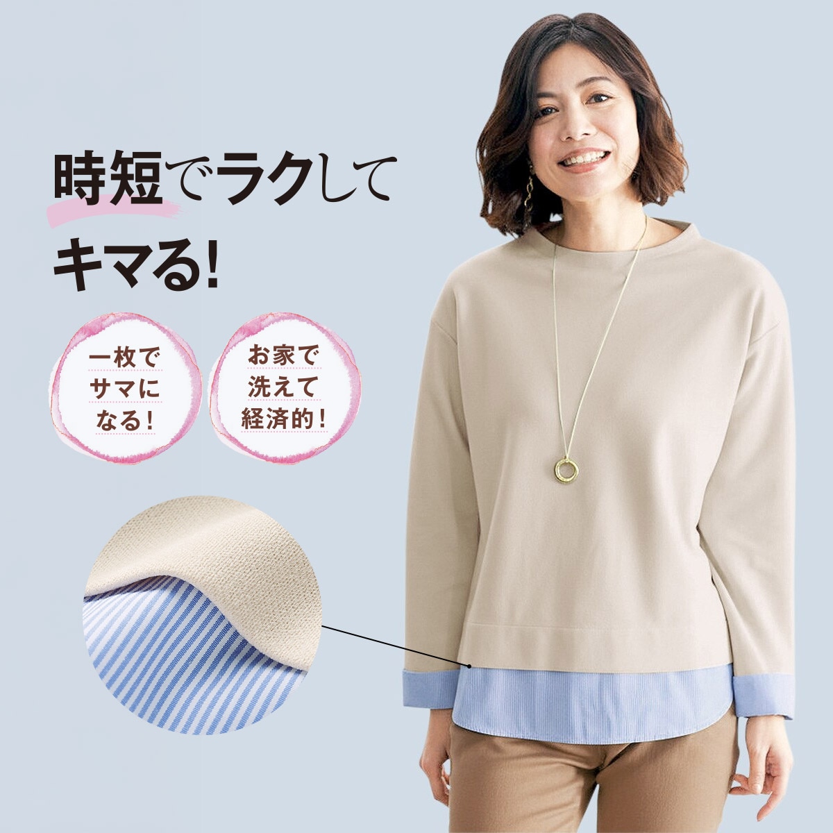 時短でラクしてキマる!一枚でサマになる重ね着風プルオーバーです。