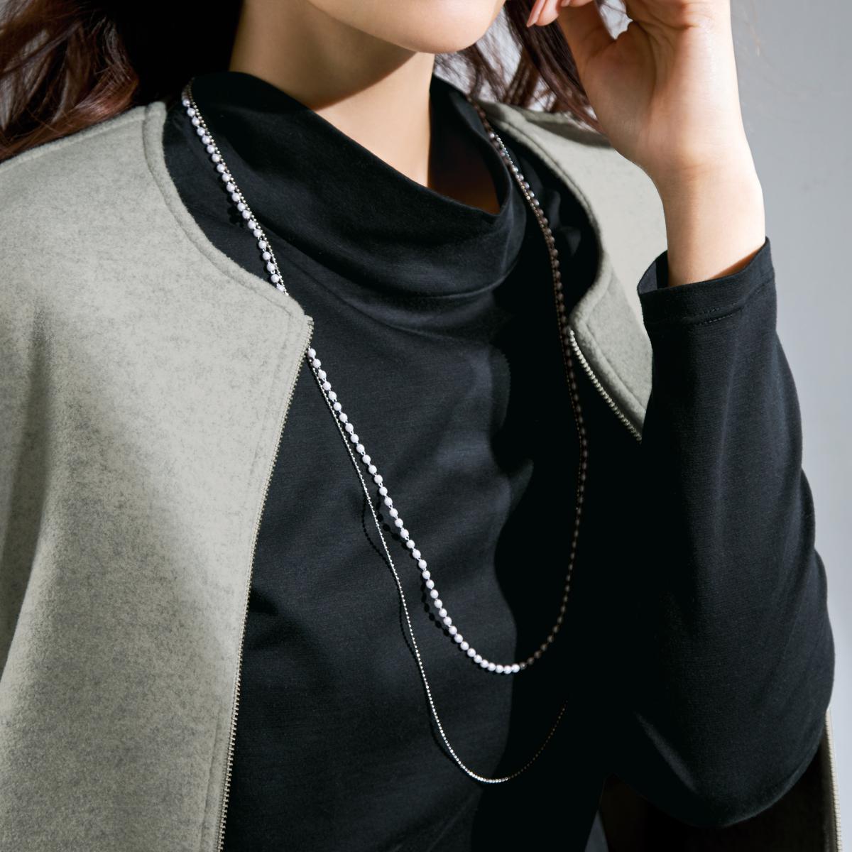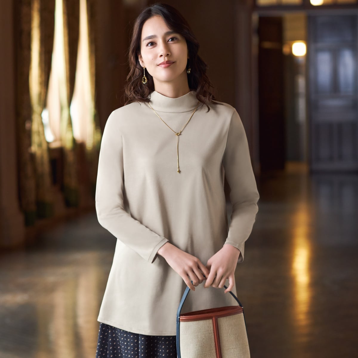 首元を隠す柔らかなハイネック。ハリとコシがあり、シワになりにくく、上品な光沢と滑らかな肌触りが特徴です。