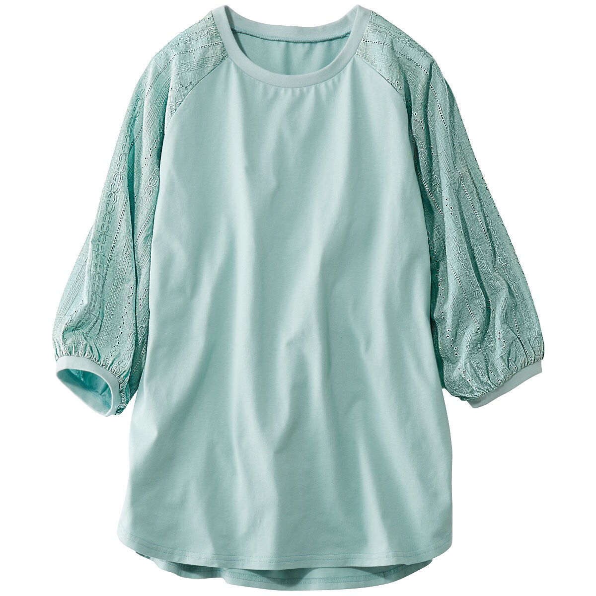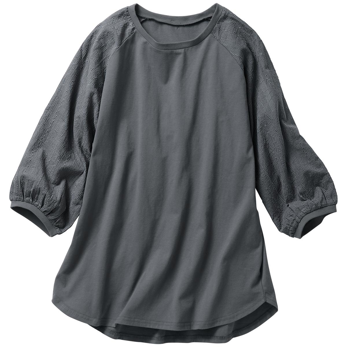 -お買い得ポイント-洗練された雰囲気を醸し出すレースをあしらった可憐なトップス。ふんわりと体をカバーするシルエットがラクな着心地とリラックス気分へ誘います。-デザイン-ラグランスリーブの袖はレース仕立てで、やや透け感があって涼しげ。ゆったりとしたシルエットと後ろ長め丈が腰まわりをカバーします。-素材特徴-柔らかな肌ざわりと軽やかな着心地のコットン100%素材。