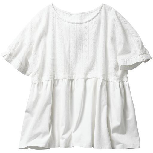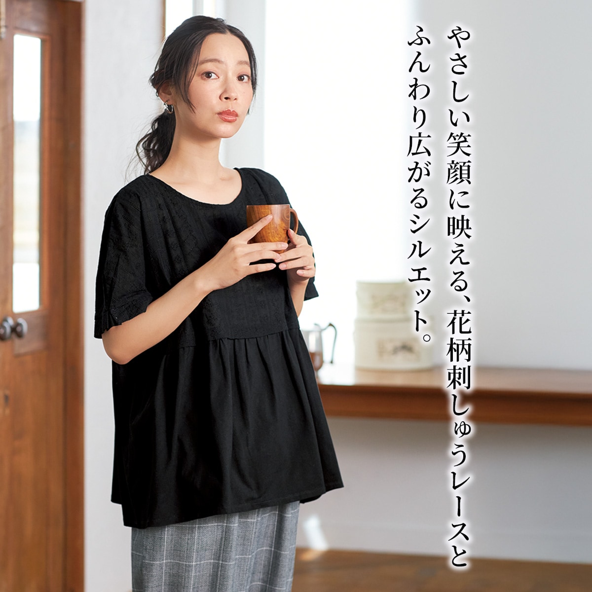 -お買い得ポイント-レースの切り替えがおしゃれで大人かわいい仕上がりになっています。-デザイン-やさしい笑顔に映える、花柄刺しゅうレースとふんわり広がるシルエット。ゆったりした着心地で袖口のタックにも心ときめきます。-素材特徴-柔らかな肌ざわりと軽やかな着心地のコットン100%素材。