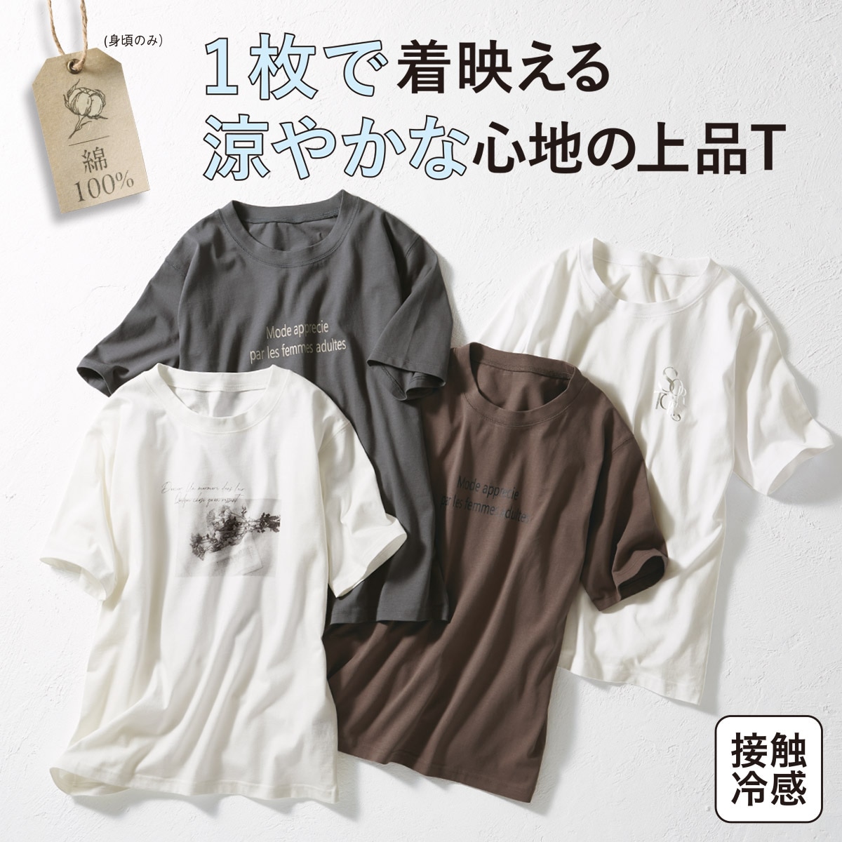 -お買い得ポイント-シルエット、肌ざわり、見た目の美しさを兼ね備えた、1枚でサマになり、大人に似合うTシャツです。-デザイン-カジュアルになりすぎず、上品にロゴを取り入れられるため、大人の女性のデイリーコーデに最適。肩線と袖ぐりの縫い代を平らにしてチクチク感やごろつきを軽減。-素材特徴-ツヤ感のある綿100%素材。
