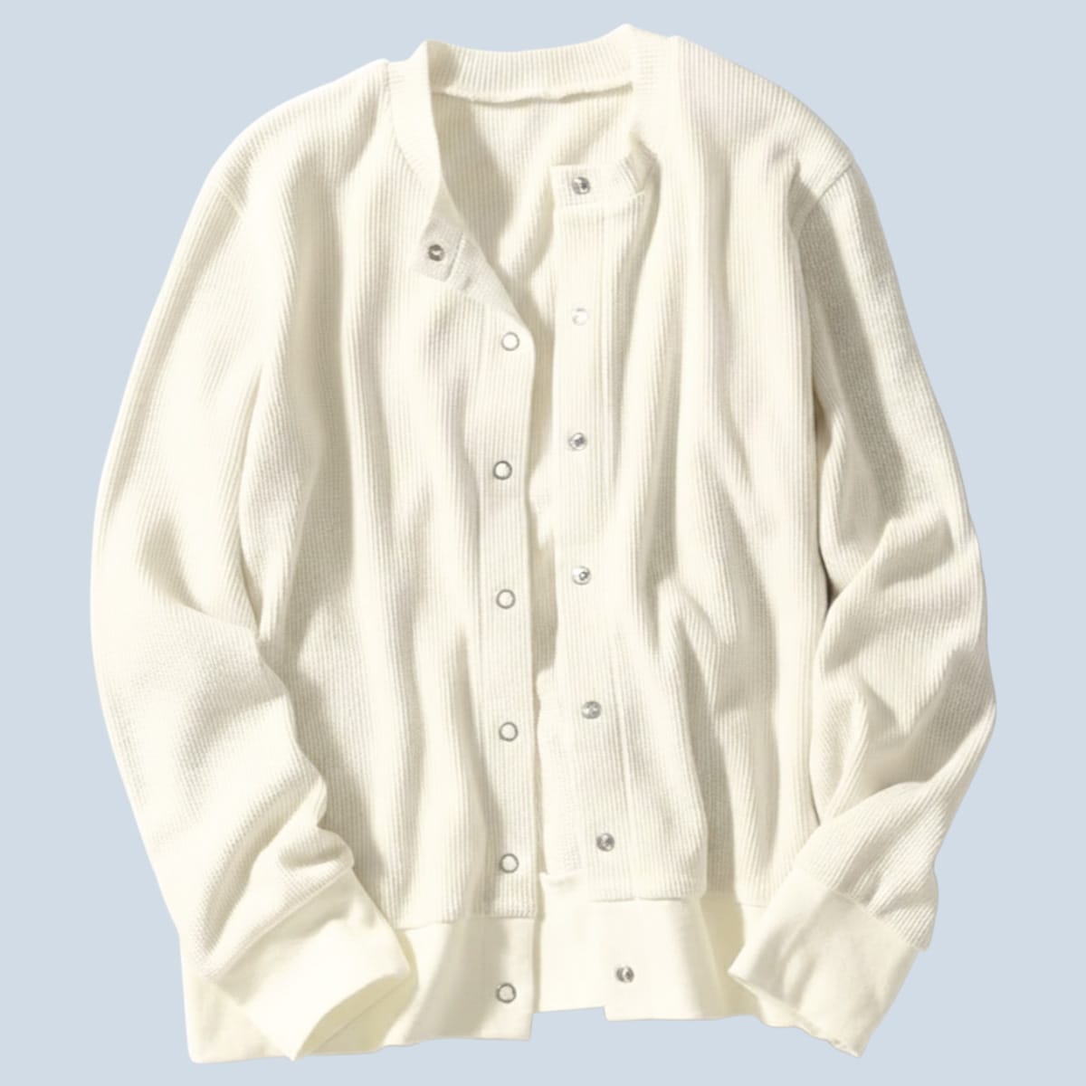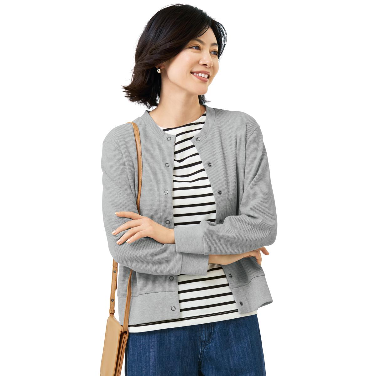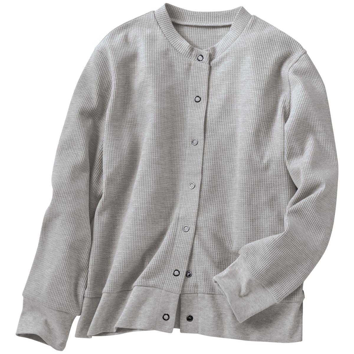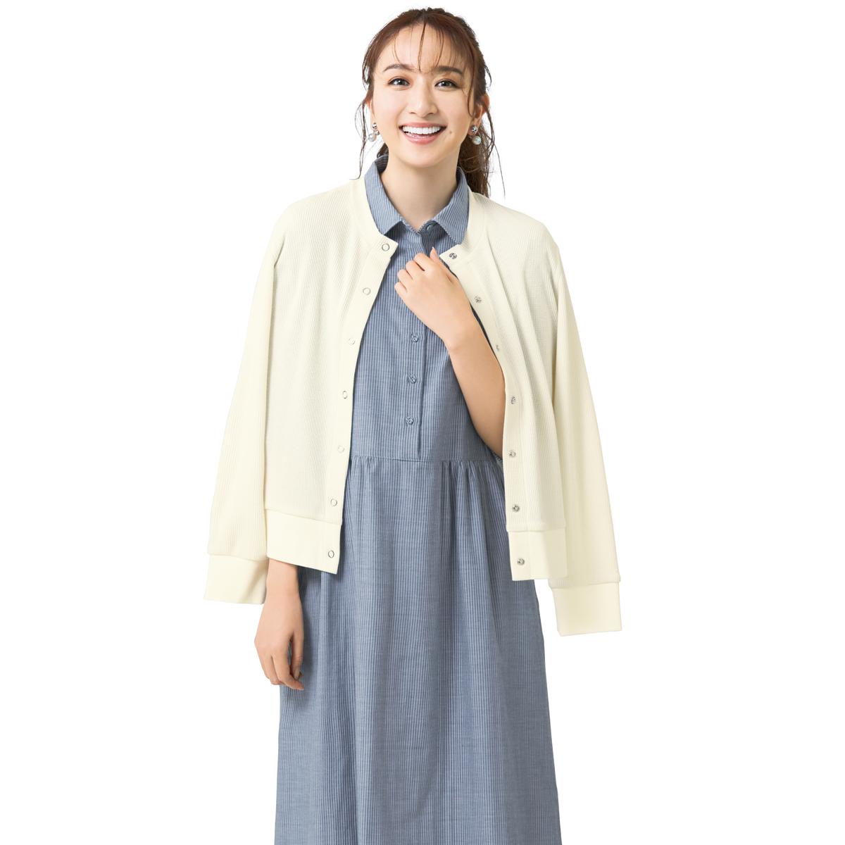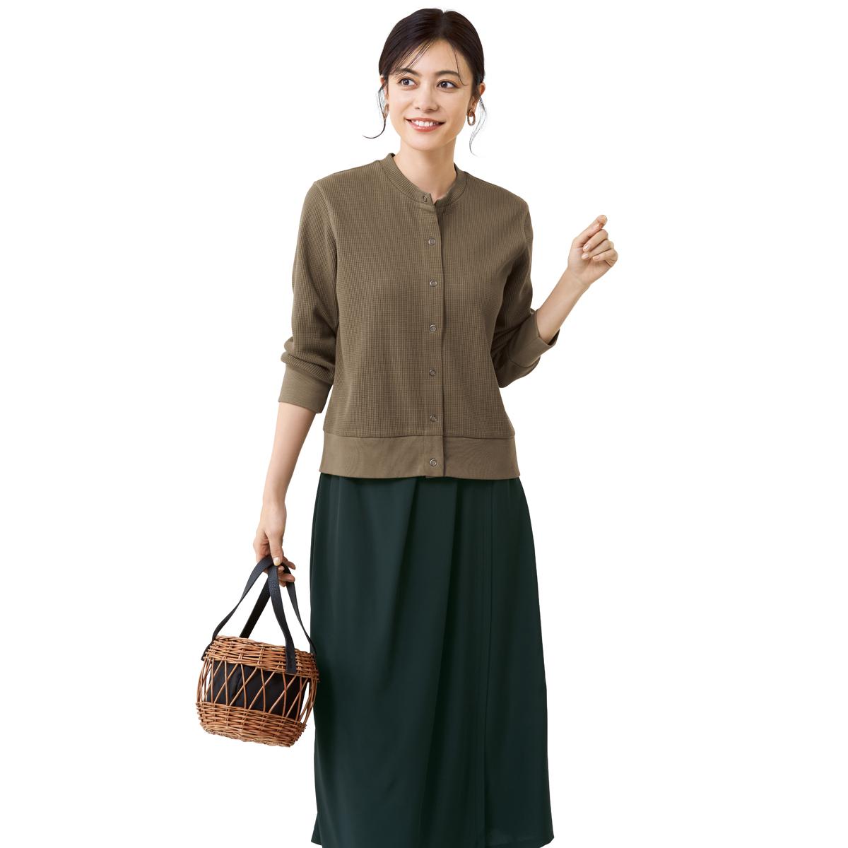 -お買い得ポイント-優れた通気性と吸汗速乾性、高い伸縮性があり、軽量でシワになりにくく、羽織りとしてロングシーズン活躍します。日除けや冷房対策におすすめな、UVカット機能付き。-デザイン-シンプルで合わせやすく、袖と裾はリブで腕まくりもしやすい。ドットボタンがカジュアル過ぎない、大人な1枚。肩線と袖ぐりの縫い代を平らにしてチクチク感やごろつきを軽減。-素材特徴-肌ざわりの良い綿混素材。ワッフルの凹凸がさらっとした着心地。