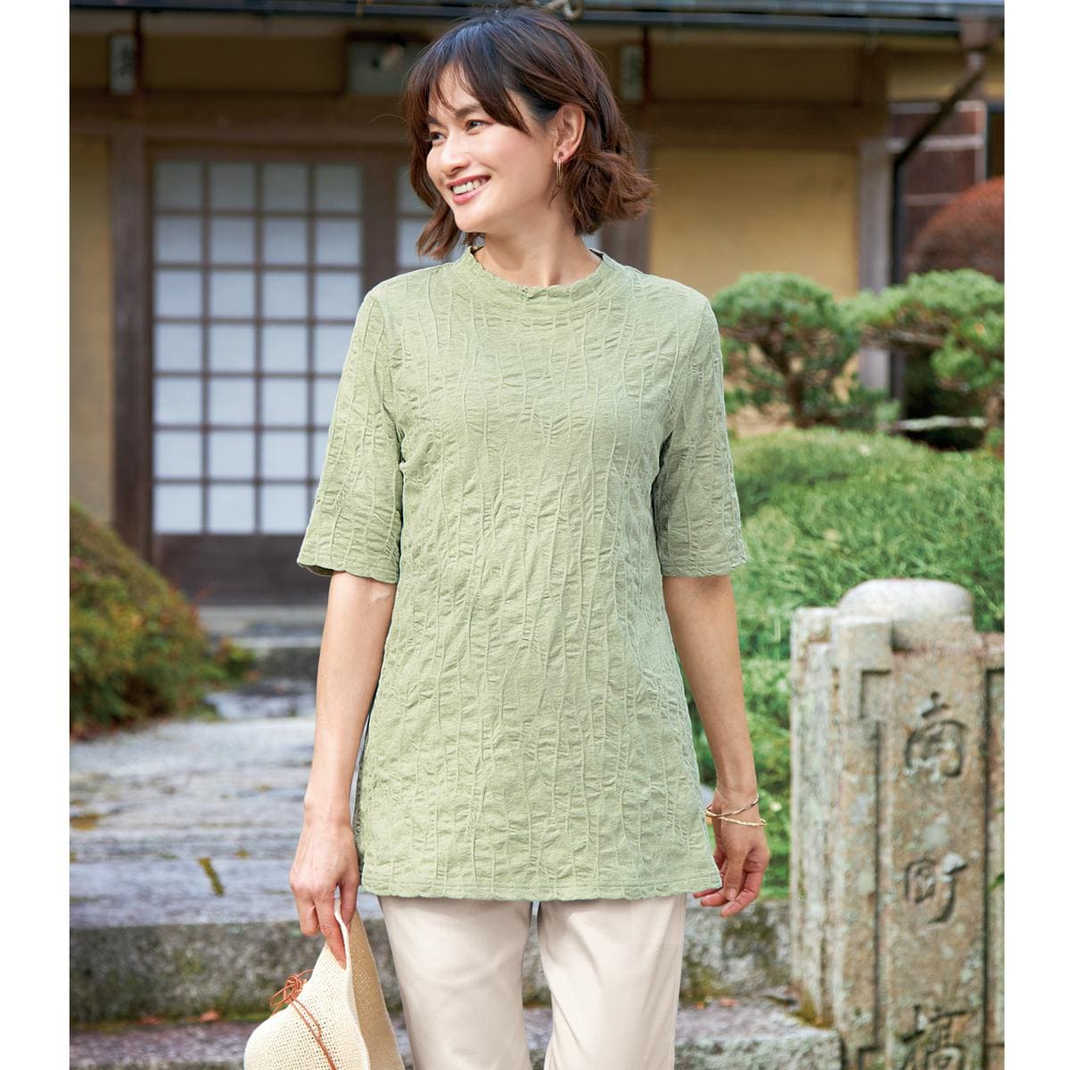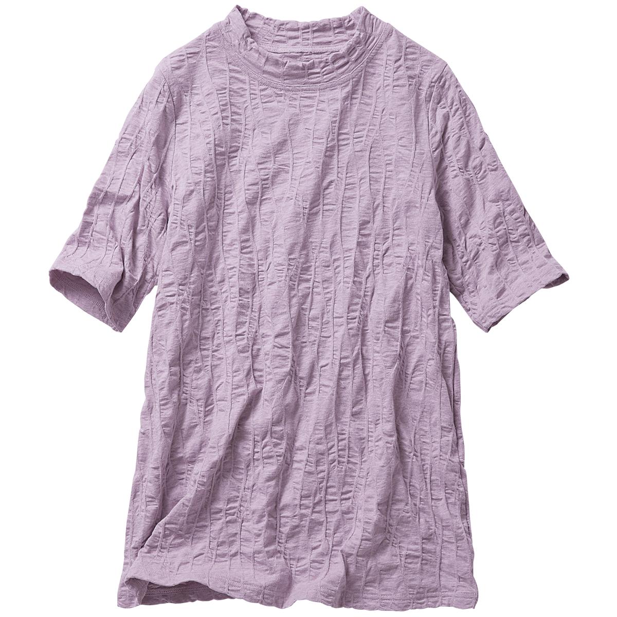 -お買い得ポイント-ちょっとしたお出かけに、1枚で決まるチュニックが欲しい季節。表面に凹凸があるので、肌に張り付かず、さわやか。サッと着るだけ、時短コーデ。-デザイン-二の腕が目立ちにくい袖丈で、プチハイネックが華奢見えを実現。-素材特徴-肌離れの良いジャカード素材で着心地も◎。
