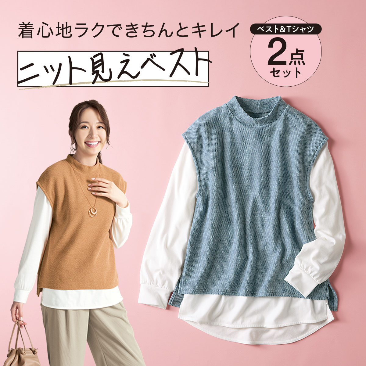 -お買い得ポイント-本格的な冬が来る前からちょうどいい、ベスト&Tシャツの重ね着スタイル。単品でも着られる2点セットがお洒落の幅も広げます。-デザイン-ニット見えするベストは、ちびハイネックで衿元をきちんと見せてくれます。シンプルな長袖Tシャツは、ラウンド裾で腰まわりを程よくカバーしてくれます。-素材特徴-ベストは表情のある杢調のカットソー素材で軽い着心地です。長袖Tシャツは肌あたりやさしい綿混素材です。