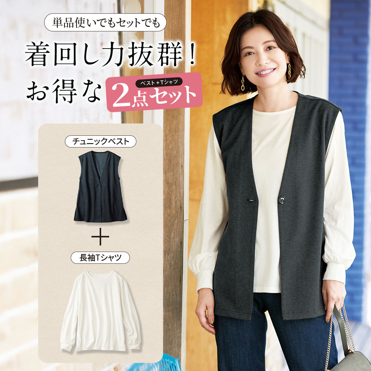 2点セット(チュニックベスト+Tシャツ)(洗濯機OK)。本格的な冬が来る前からちょうどいい、前開きベスト&Tシャツの重ね着スタイル。