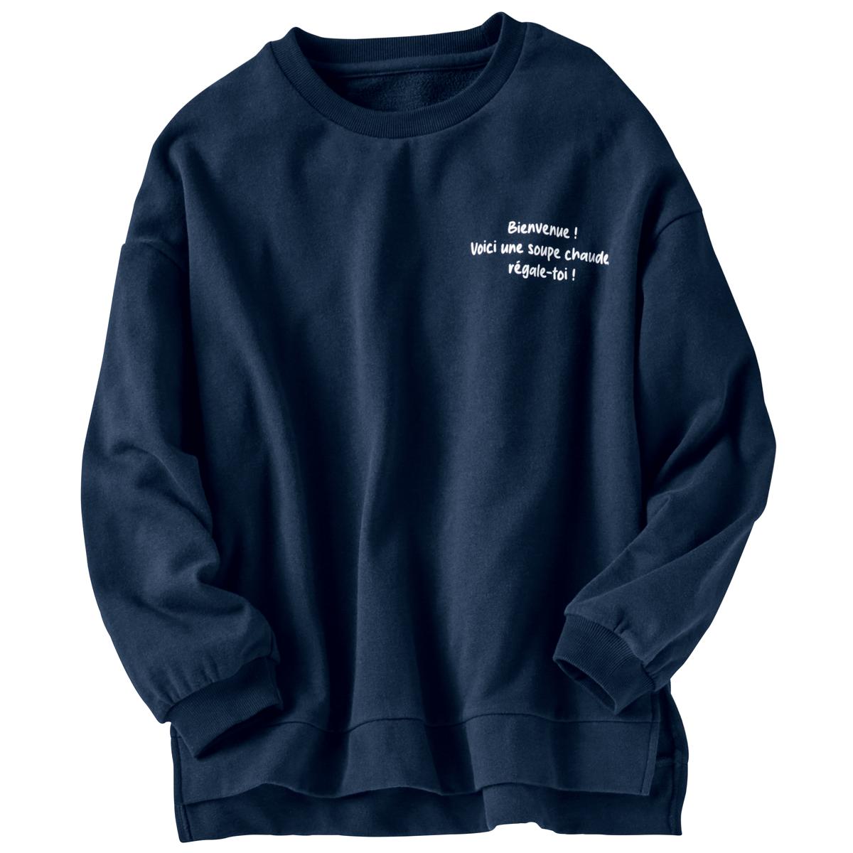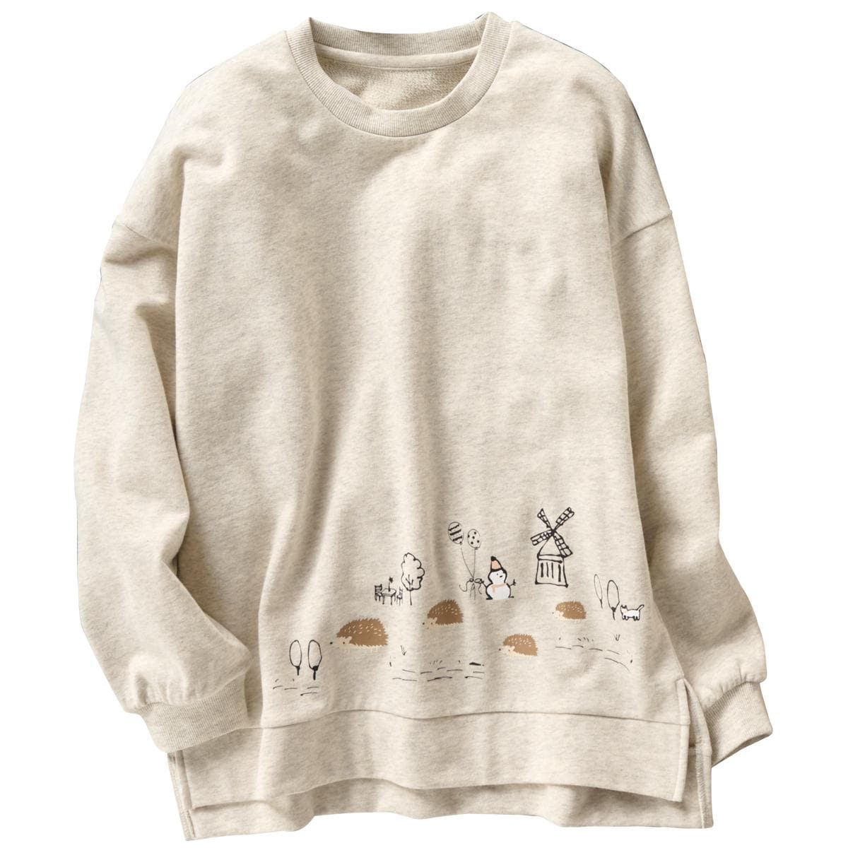-お買い得ポイント-毎年人気のプリントトレーナーに今年も新柄が登場!!-デザイン-主張しすぎないデザインが好評!クルーネックで首元すっきり。前後差のある裾はスリット入りで窮屈感なく着こなせます。-素材特徴-肌ざわりがいい綿素材。ふくらみのある裏毛素材にリニューアルしました!