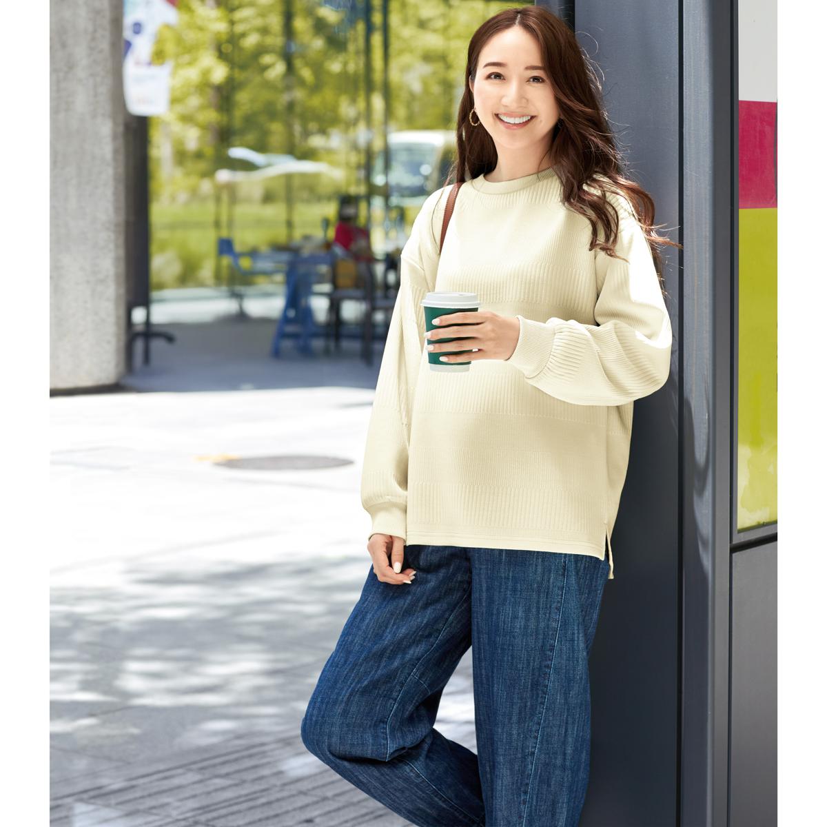 -お買い得ポイント-シンプルなデザインでボトムを選ばず、着回しやすい!-デザイン-後長めの丈でヒップをカバー。両脇スリット入りで窮屈感のない着心地です。-素材特徴-変則リブ編みが縦ラインを強調し、スリムな印象に。