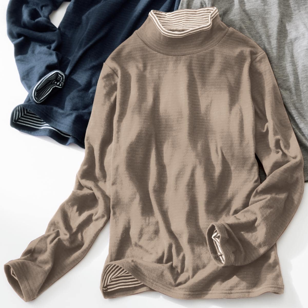 -お買い得ポイント-適度な厚みの柔らかな風合いがデイリー使いに◎。ボトムを選ばず、着回しやすいので1つは持っておきたいアイテムです。ふんわり軽く優しい肌触りで温かなのもこれからの季節にうれしいポイントです。-デザイン-衿元から表地と同系色のボーダーがチラリと見えておしゃれ。-素材特徴-空気の層を含んで温もりのあるふわっと柔らかな接結素材。