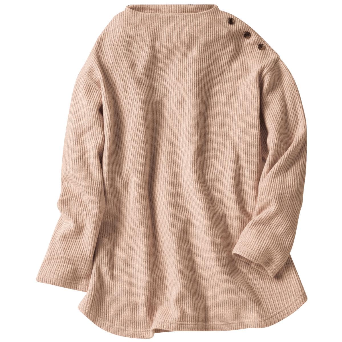 -お買い得ポイント-マカロンカラーがこの冬のスタイリングのポイントに!乾燥機OKなニット見えカットソーで簡単ケア。-デザイン-すっきり上品なモックネックに肩にあしらった飾りボタンがアクセント。腰まで包みこむ丈感とラウンド裾がカワイイ♪-素材特徴-洗濯機で洗えて乾燥機もOK。素材感もふんわり。まるでニットのような柔らかい着心地。