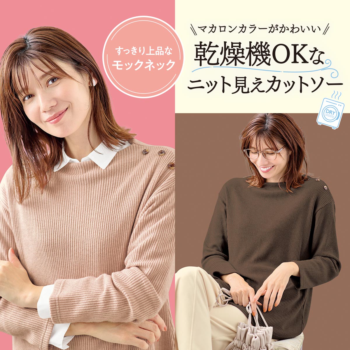 マカロンカラーがこの冬のスタイリングのポイントに!乾燥機OKなニット見えカットソーで簡単ケア。