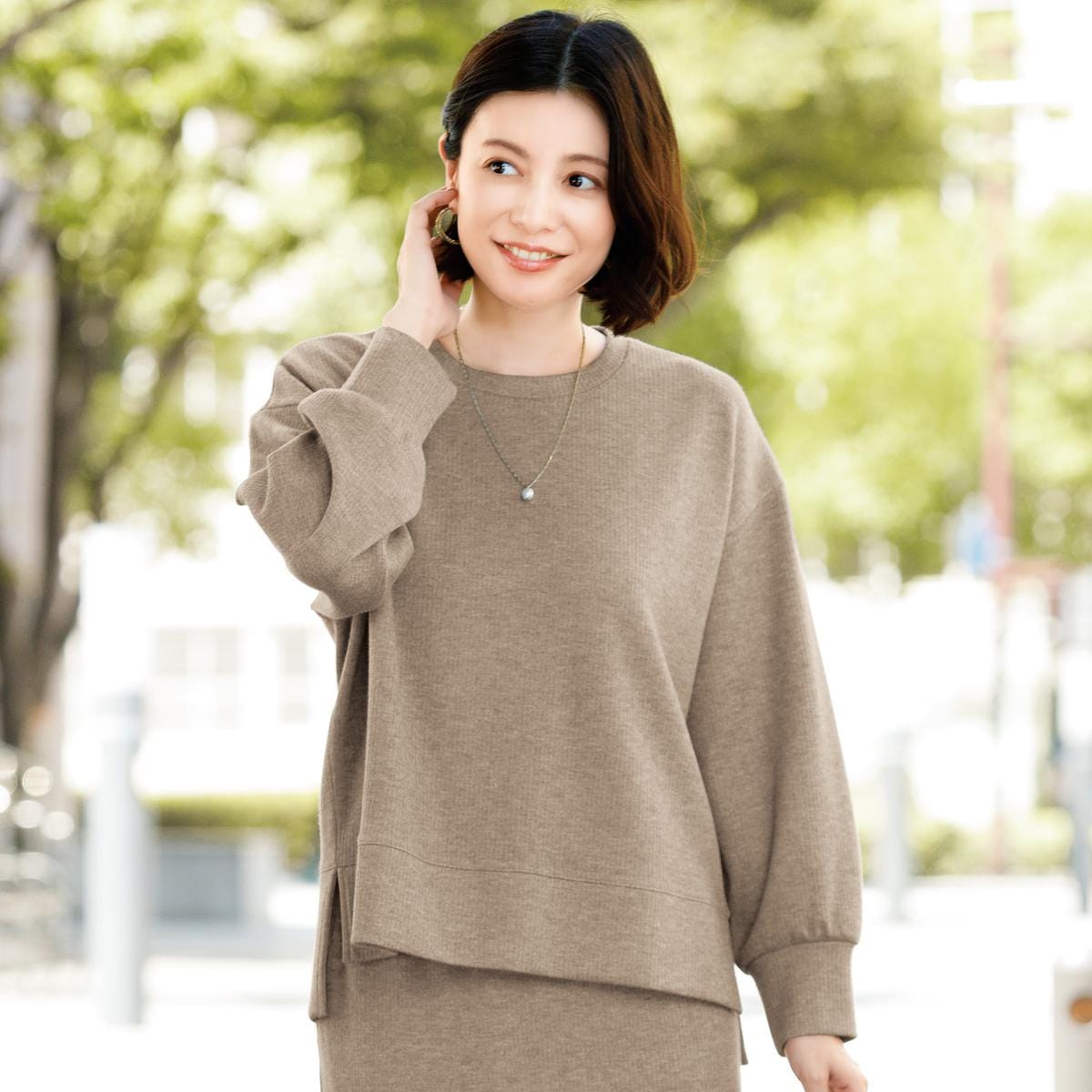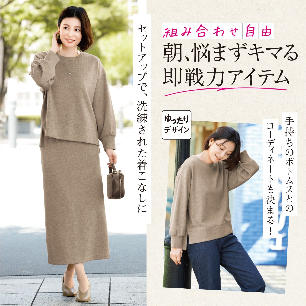 セットアップで、洗練された着こなしに。ボディラインを拾いにくい、ゆったりシルエットで着心地ラクチン。
