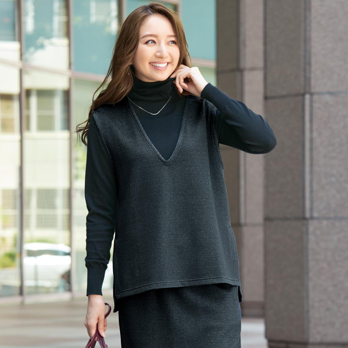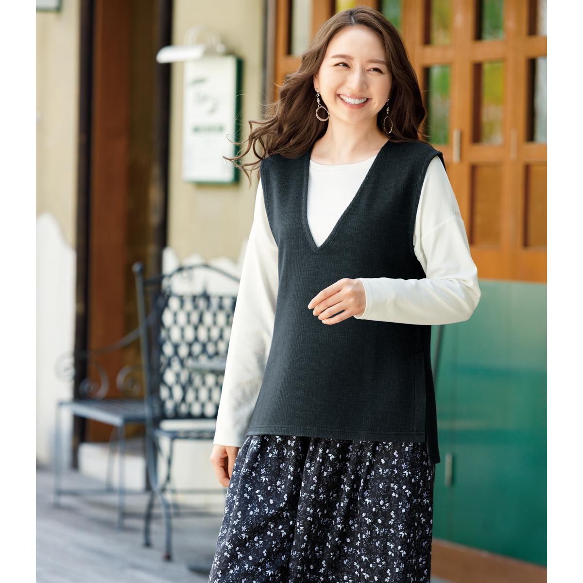深めのVネックやサイドスリットが抜け感を生んで軽やかな印象。