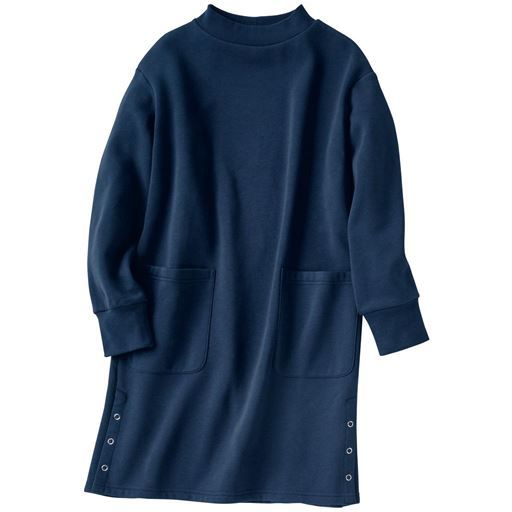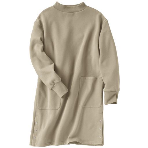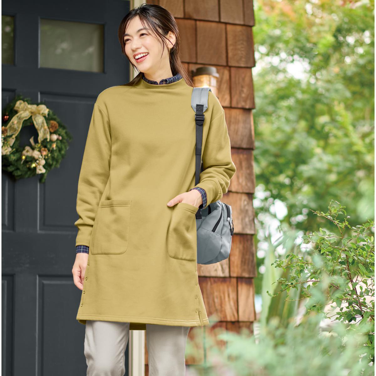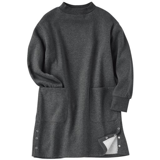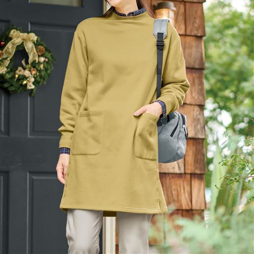 -お買い得ポイント-お尻回りもカバーできる丈で軽くてやわらかな裏起毛が空気を含んでふんわりあったか。-デザイン-スマホが入る大きめポケット付き。裾にはボタンがあり、このボタンを開けるとスリットデザインになるのが特徴です。チュニックなので首元から腰まわりまですっぽり包んであったか。-素材特徴-裏起毛のカットソーは肌ざわりも柔らかく、快適な着心地です。