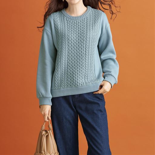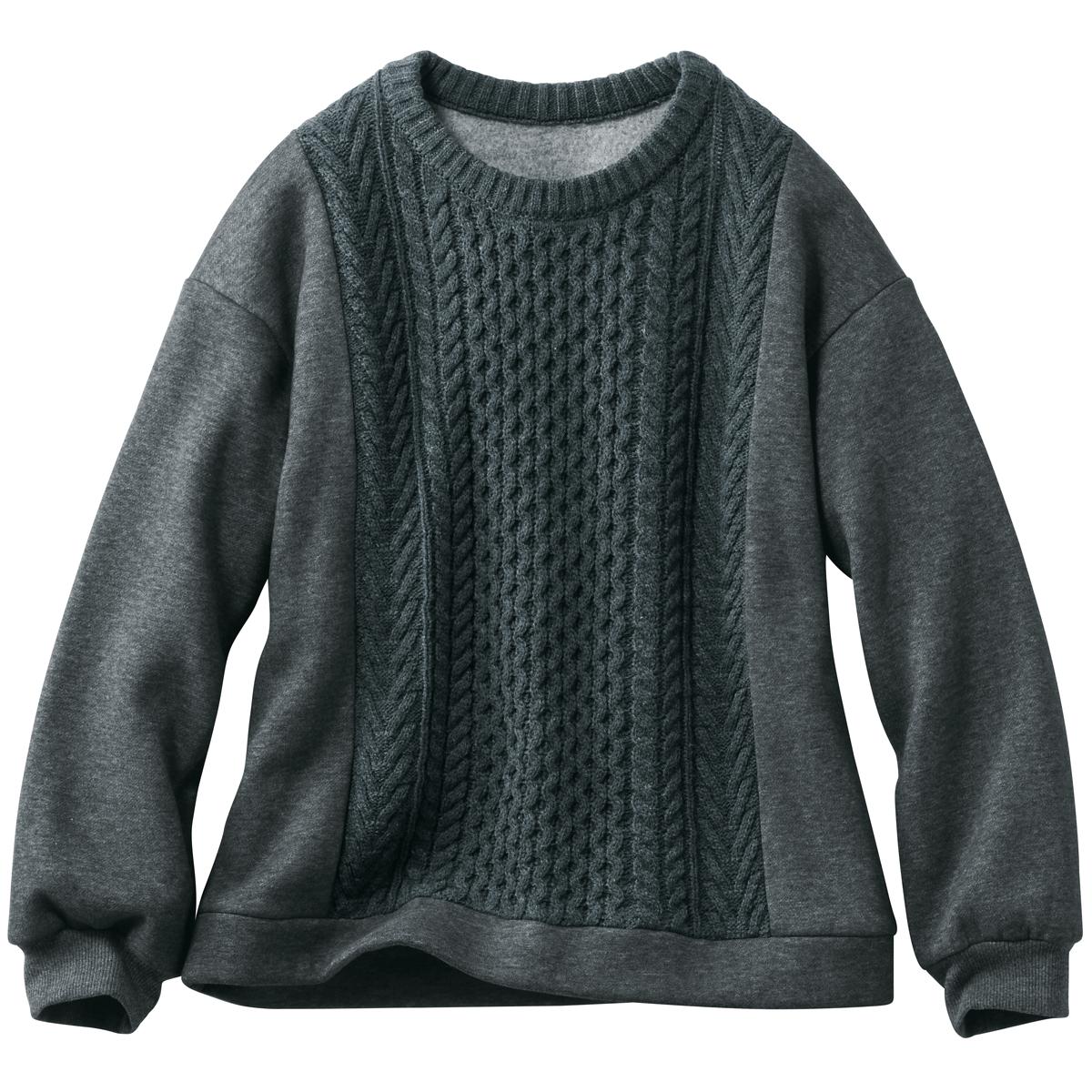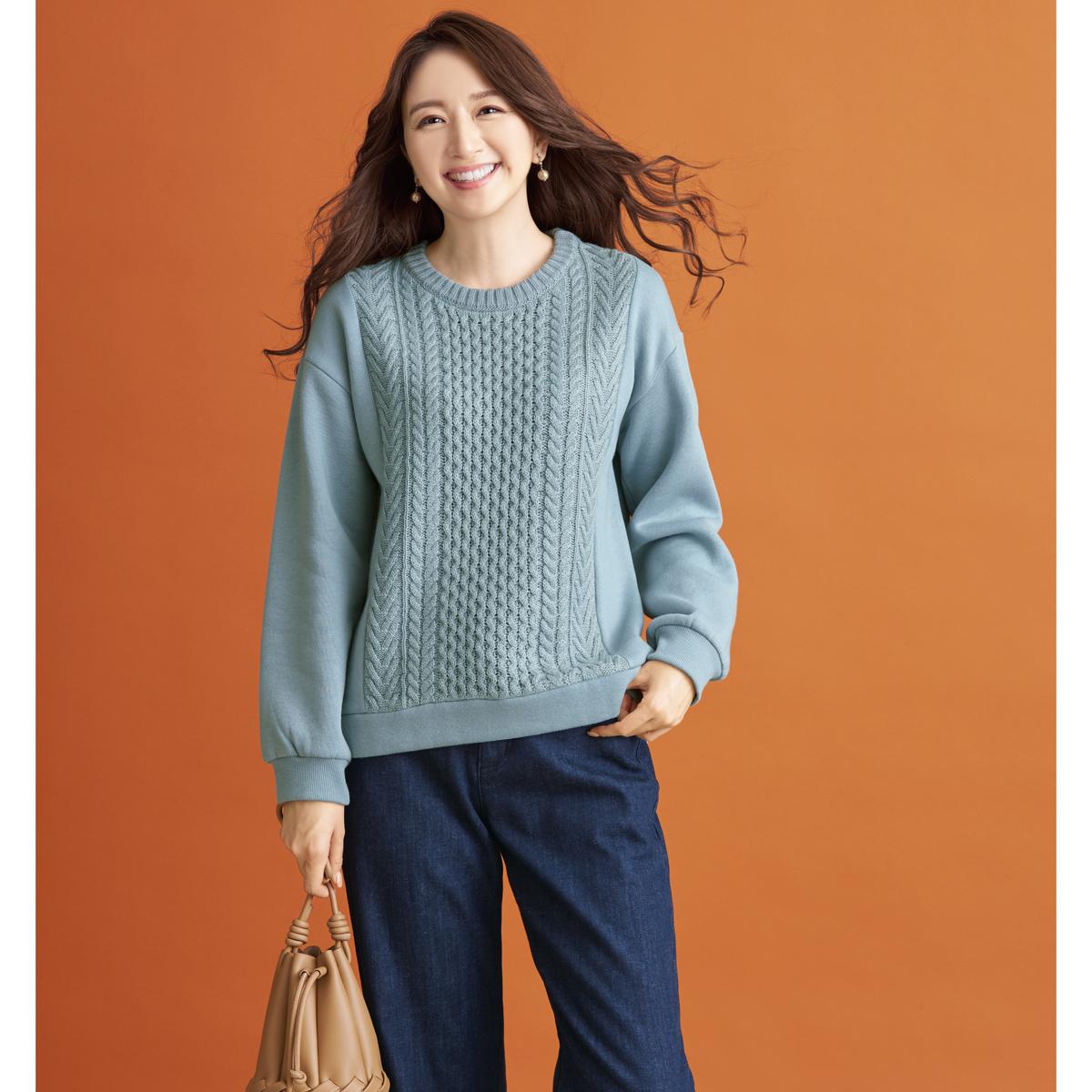-お買い得ポイント-すっきりと見える異素材合わせがポイント。編み地が変わることでオシャレな印象へ♪裏起毛なのであたたかく着れるので寒い日も快適。-デザイン-フロントに表面感のあるニットをあしらったシンプルなプルオーバー。ゆったりしたシルエットでボディーラインも拾いにくく安心なデザイン設定です。-素材特徴-スウェット部分は裏起毛で暖かく、ラクな着心地。