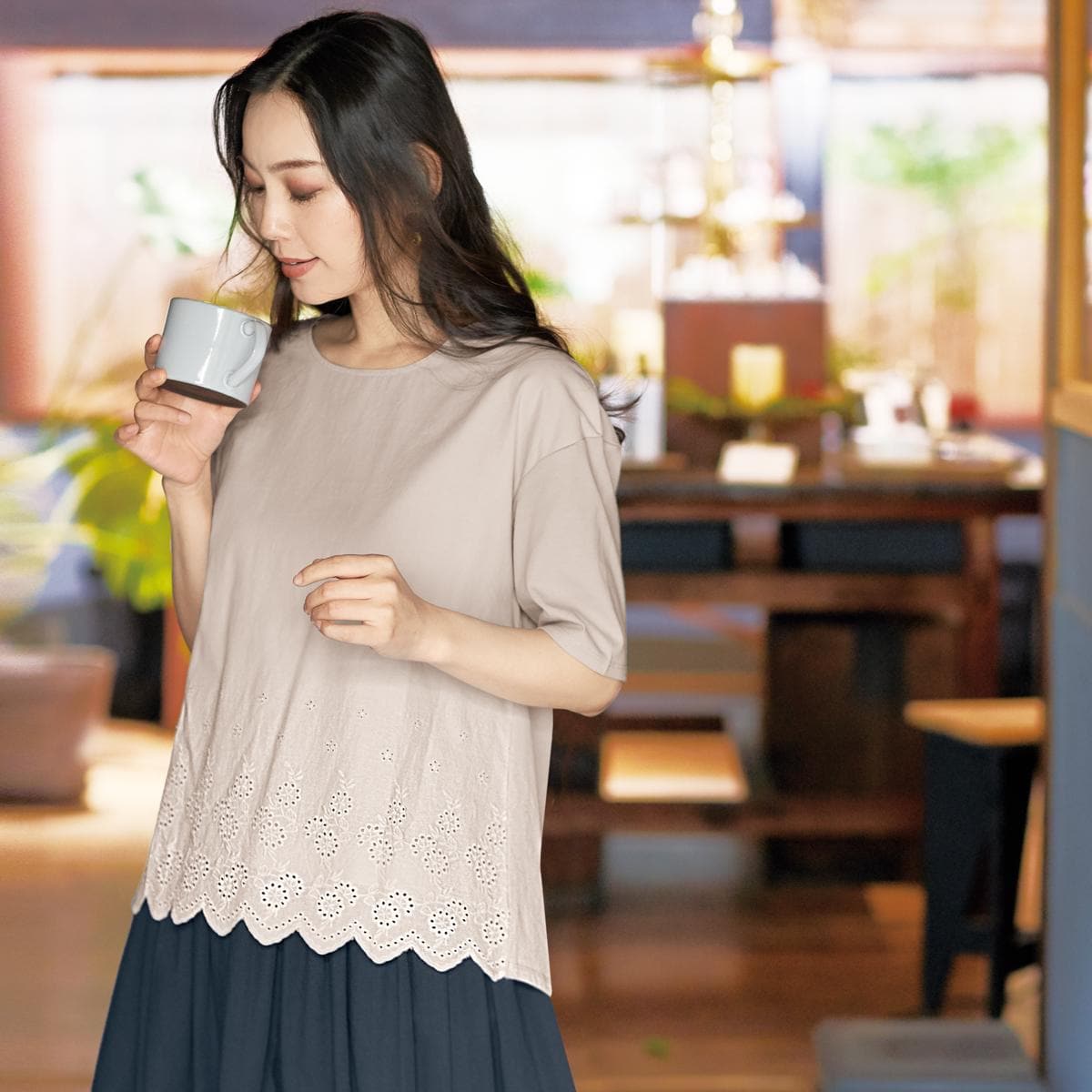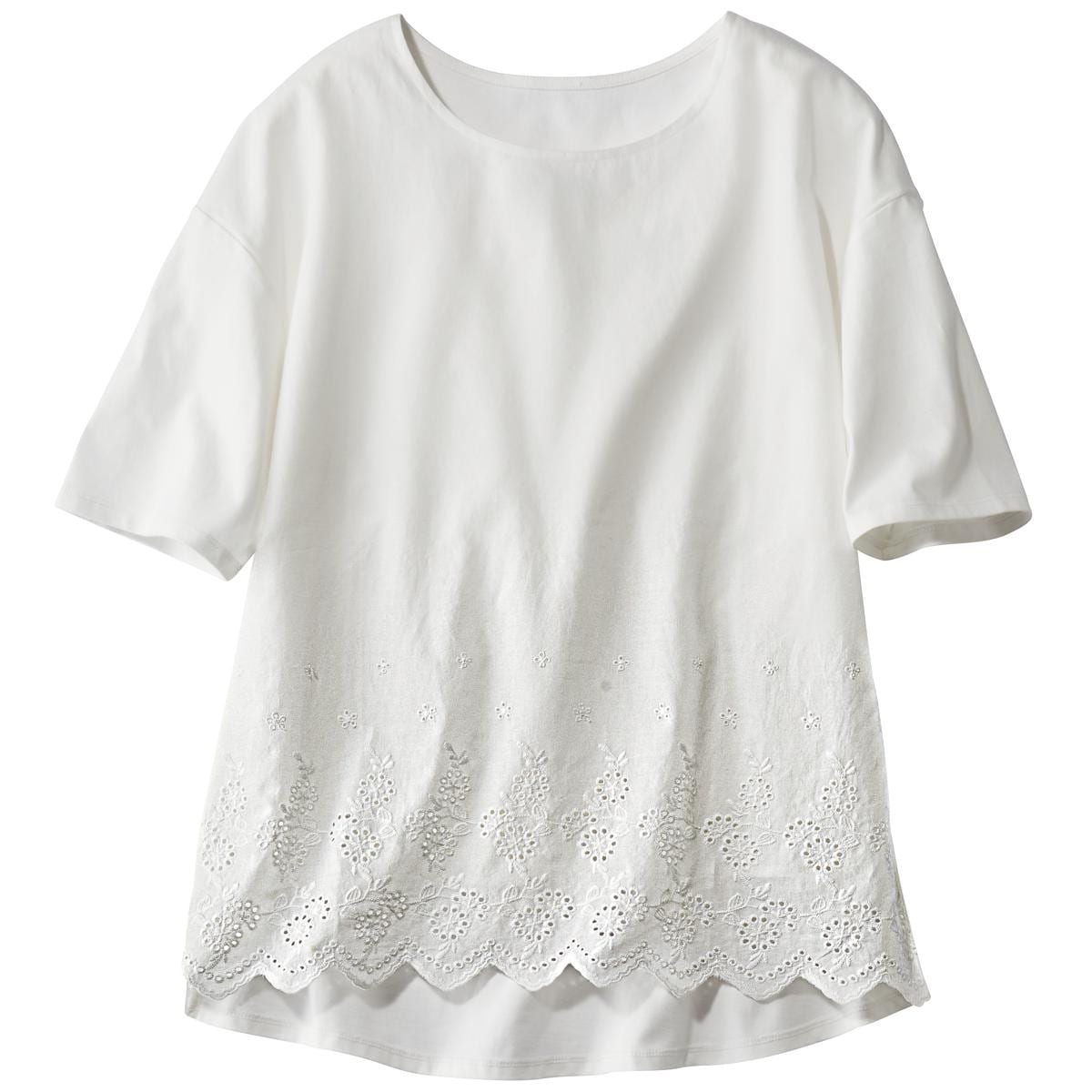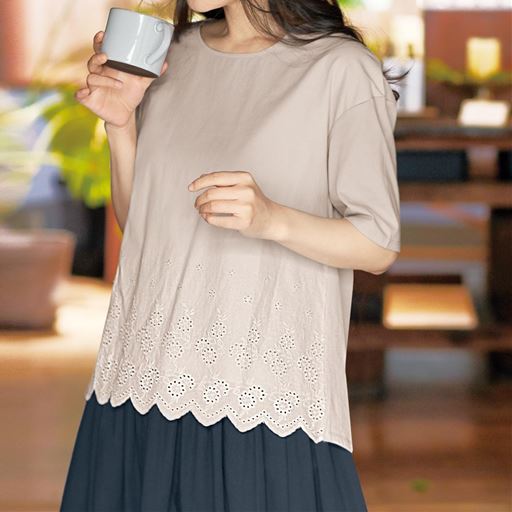 -お買い得ポイント-洗練された雰囲気を醸し出すレースをあしらった可憐なトップス。ふんわりと体をカバーするシルエットがラクな着心地とリラックス気分へ誘います。-デザイン-裾スカラップレースで華やか。フロントは二重仕立てで透けにくく、一枚で安心して着られます。-素材特徴-柔らかな肌ざわりと軽やかな着心地のコットン100%素材。