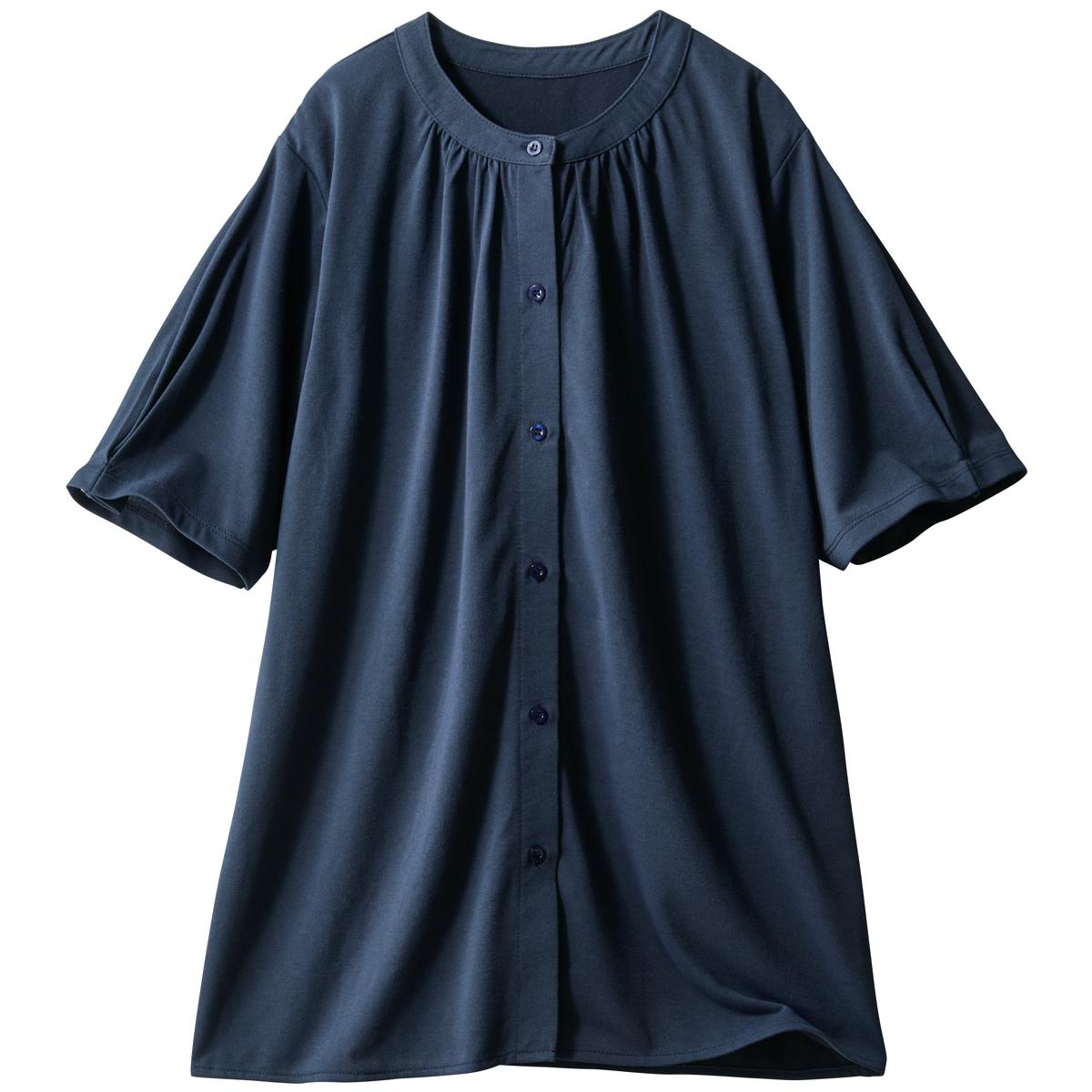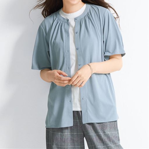 -お買い得ポイント-サラッとした肌触りで着心地が良く、前を閉じるときちんと感のあるクルーネックシャツ。羽織りとしても重宝します。-デザイン-ゆったりとしたシルエットや衿元のギャザーなどで、上品さと動きやすさを両立しています。 -素材特徴-光の乱反射で透けにくく、汗染みを見えにくくするから安心。吸汗速乾機能で汗ばむ季節に心地良く着られる薄手素材です。