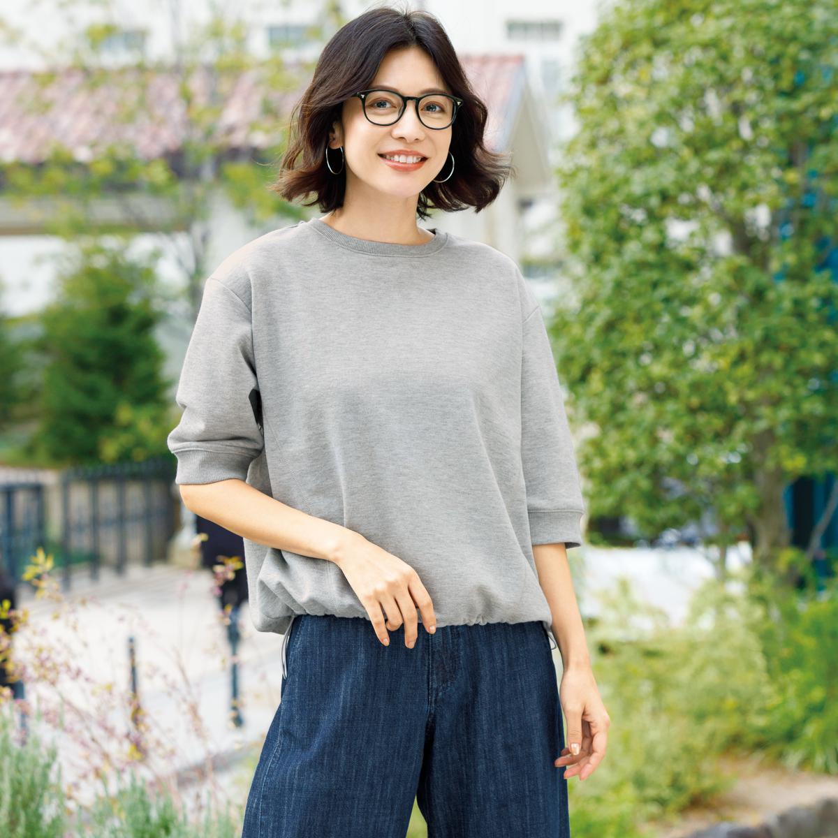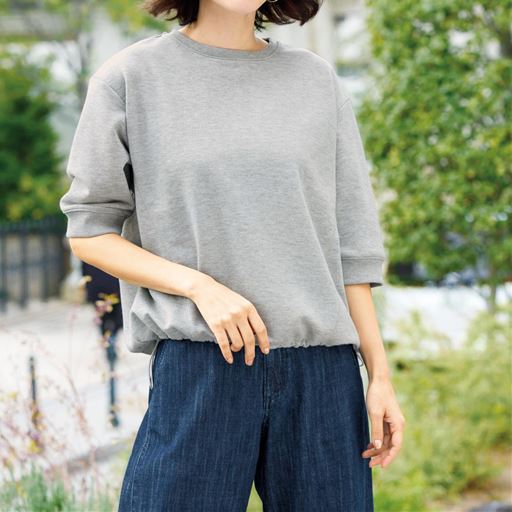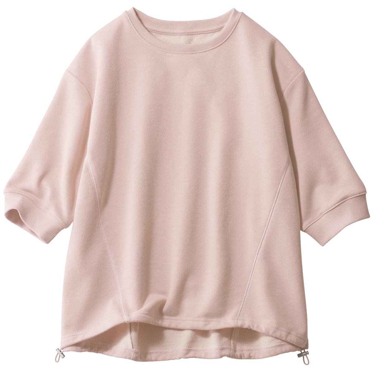 -お買い得ポイント-カジュアルな印象の裏毛素材にラメを入れ、キレイ目な商品に仕上げました。Tシャツ感覚で着まわせ、程よくゆったりシルエットですっきりしたボトムスに合わせたスタイルがお勧め◎。-デザイン-ゆったりしたフォルムで着心地ラク。裾のドロストを絞って、シルエットの変化を楽しめます。-素材特徴-ほのかな煌めきが上品なシルバーラメ入り裏毛素材。