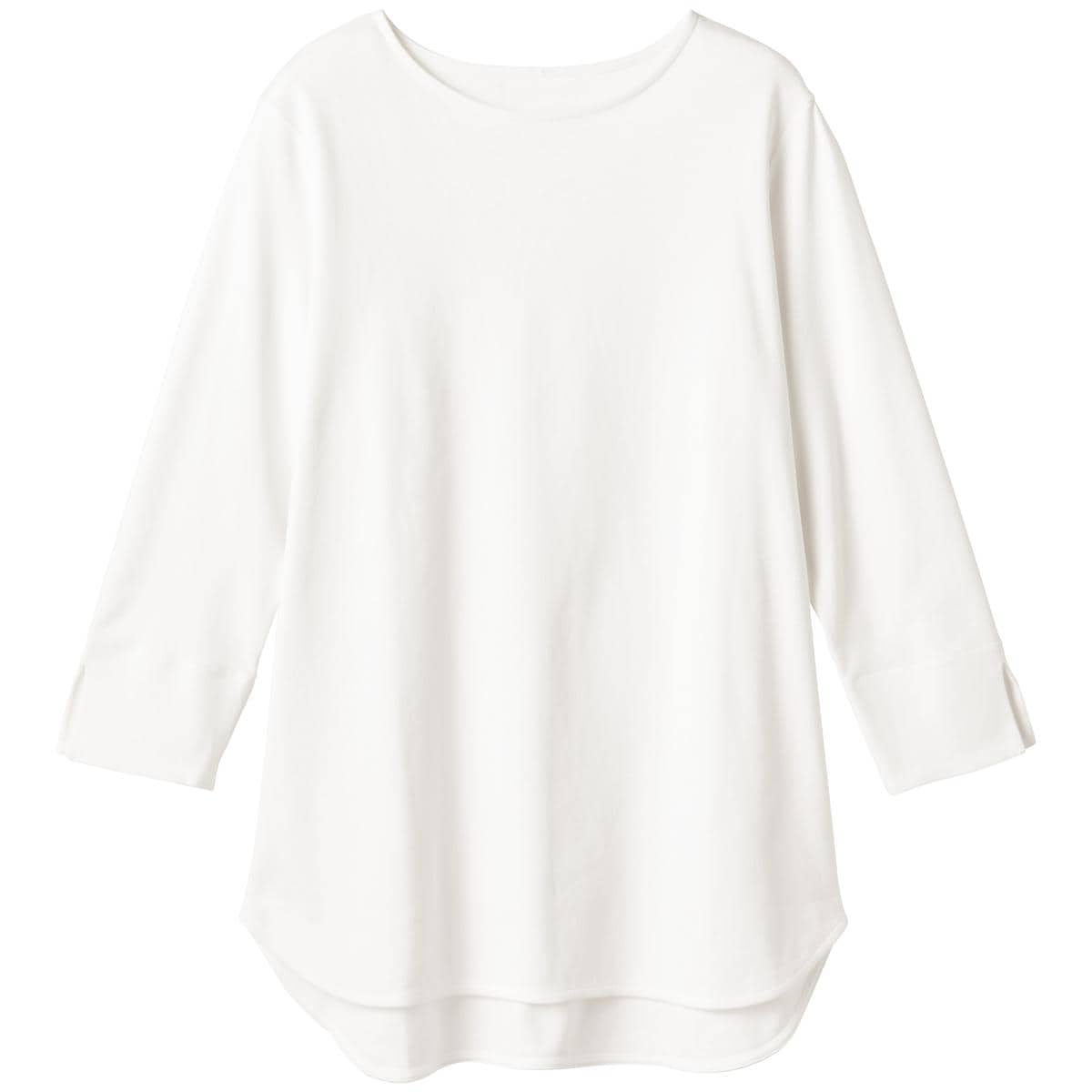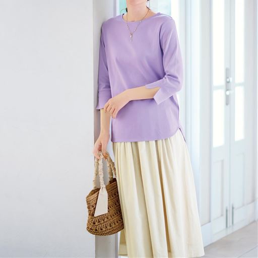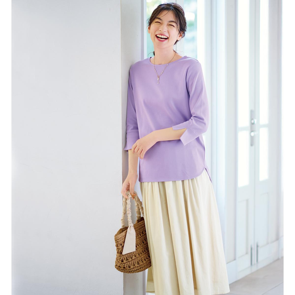-お買い得ポイント-着た瞬間、もっちり、なめらか、カジュアルすぎない大人のTシャツです。着たときのシルエット、肌ざわり、見た目の美しさ、1枚で着てもサマになるディテールにこだわりました。-デザイン-ラウンド裾でスタイルアップ!腰まわりが隠れるロング丈。袖口を折り返して抜け感を出しても◎。-素材特徴-表面がなめらかで心地よい肌触りです。柔らかな風合いで見た目にも高級感があります。