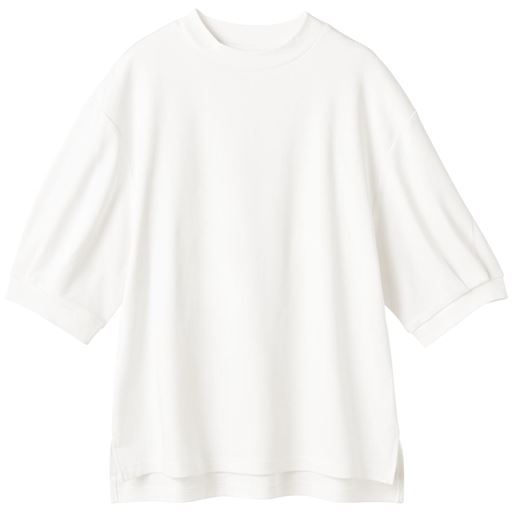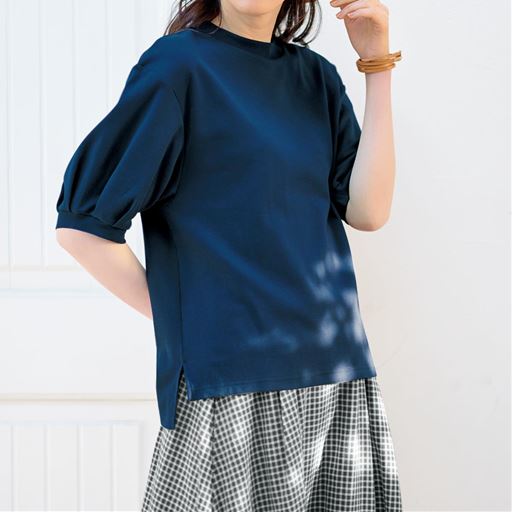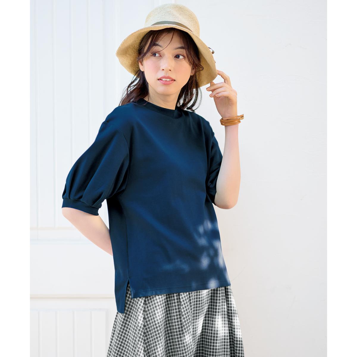 -お買い得ポイント-手軽にサッと1枚で着られる夏にうれしいTシャツ。体型カバーも叶えるこだわりのデザインもポイントです。-デザイン-二の腕をカバーしてくれるふんわりボリューム袖がコーディネートのアクセントに。裾に前後差をつけて前はすっきり短め、後ろは長めでヒップをカバー。-素材特徴-綿100%で程よい肉厚感があるのに軽く、ストレッチ性があります。