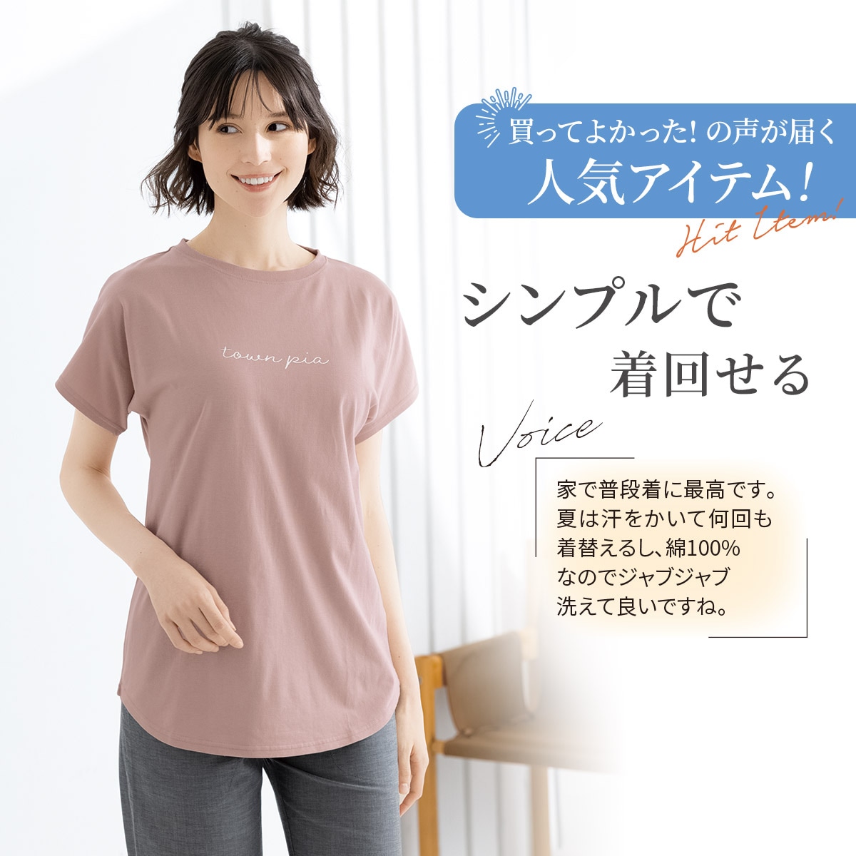 ゆるTなのに上品に決まる、大人っぽいニュアンスカラーのコットンTシャツ。顔まわりがすっきり見えるプチボートネックタイプ。ラクに着られるゆるっとしたシルエットはリラックス感たっぷり。肩の落ち感がかわいいフレンチ袖やロゴプリント、ウエストアウトもおしゃれなラウンド裾など、こなれ感のあるアウターライクなデザインだから、ルームウェアとしてはもちろん、デイリーに幅広く活躍します。後ろ衿ぐりパイピング仕様で型崩れを防ぎやすいです。素材はやわらかくて丈夫な綿100%SZ天竺素材。大きいサイズ(~5L)もあります。