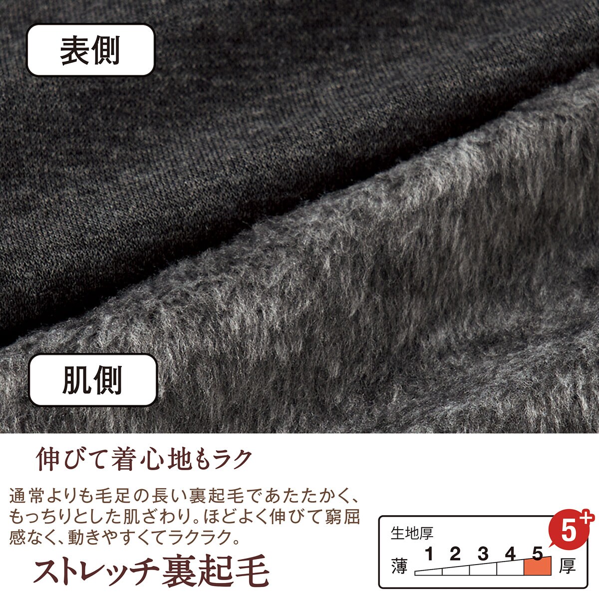 伸びて着心地もラク 通常よりも毛足の長い裏起毛であたたかく、もっちりとした肌ざわり。ほどよく伸びて窮屈感なく、動きやすくてラクラク。 ストレッチ裏起毛
