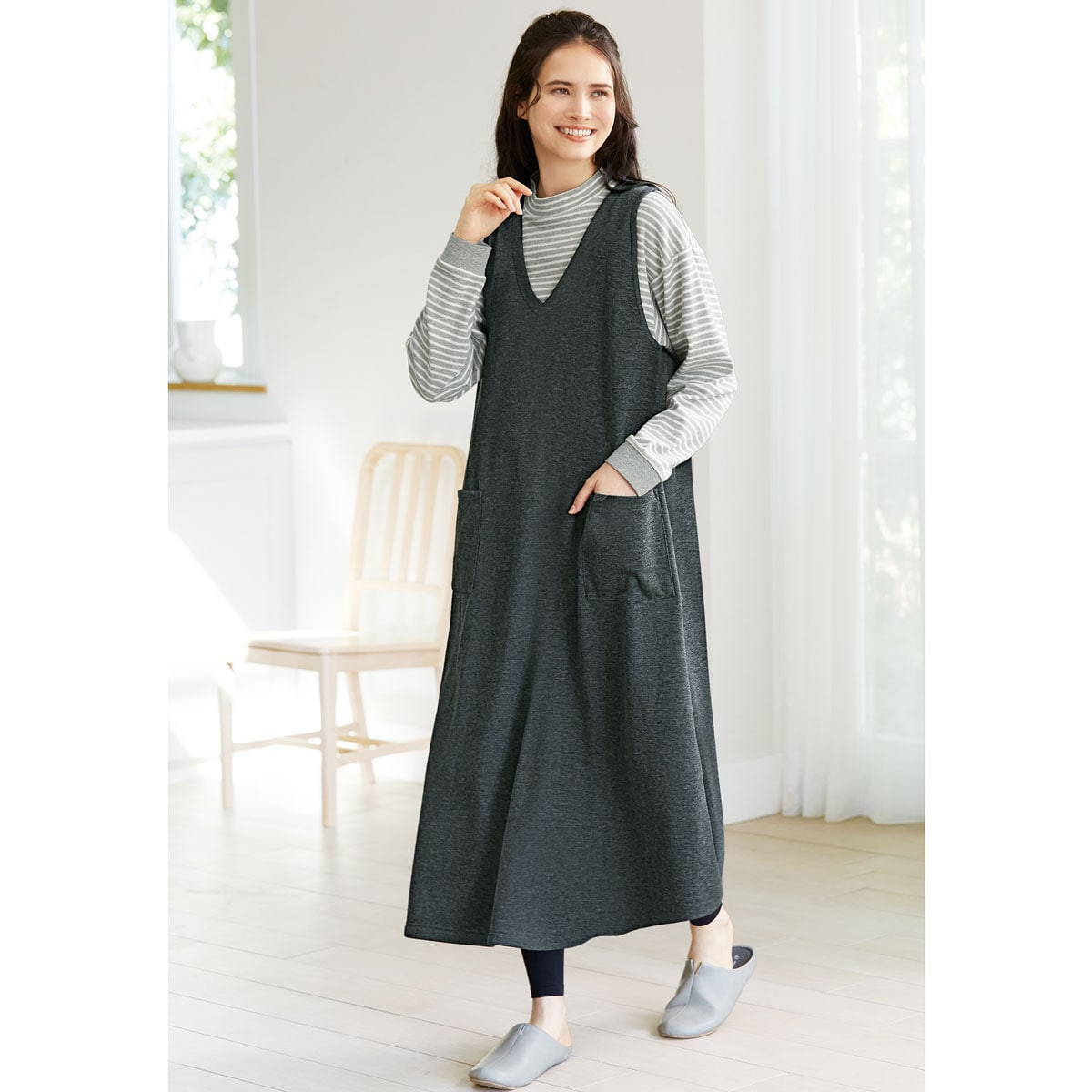 すぽっとかぶるだけ♪ストレッチ裏起毛のジャンパースカート。すっぽり包む丈感と動きやすさが家事にぴったり。ふっくらさん対応サイズplump(プランプ)もあります。