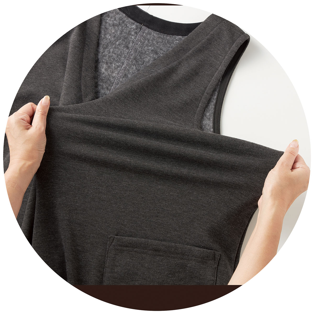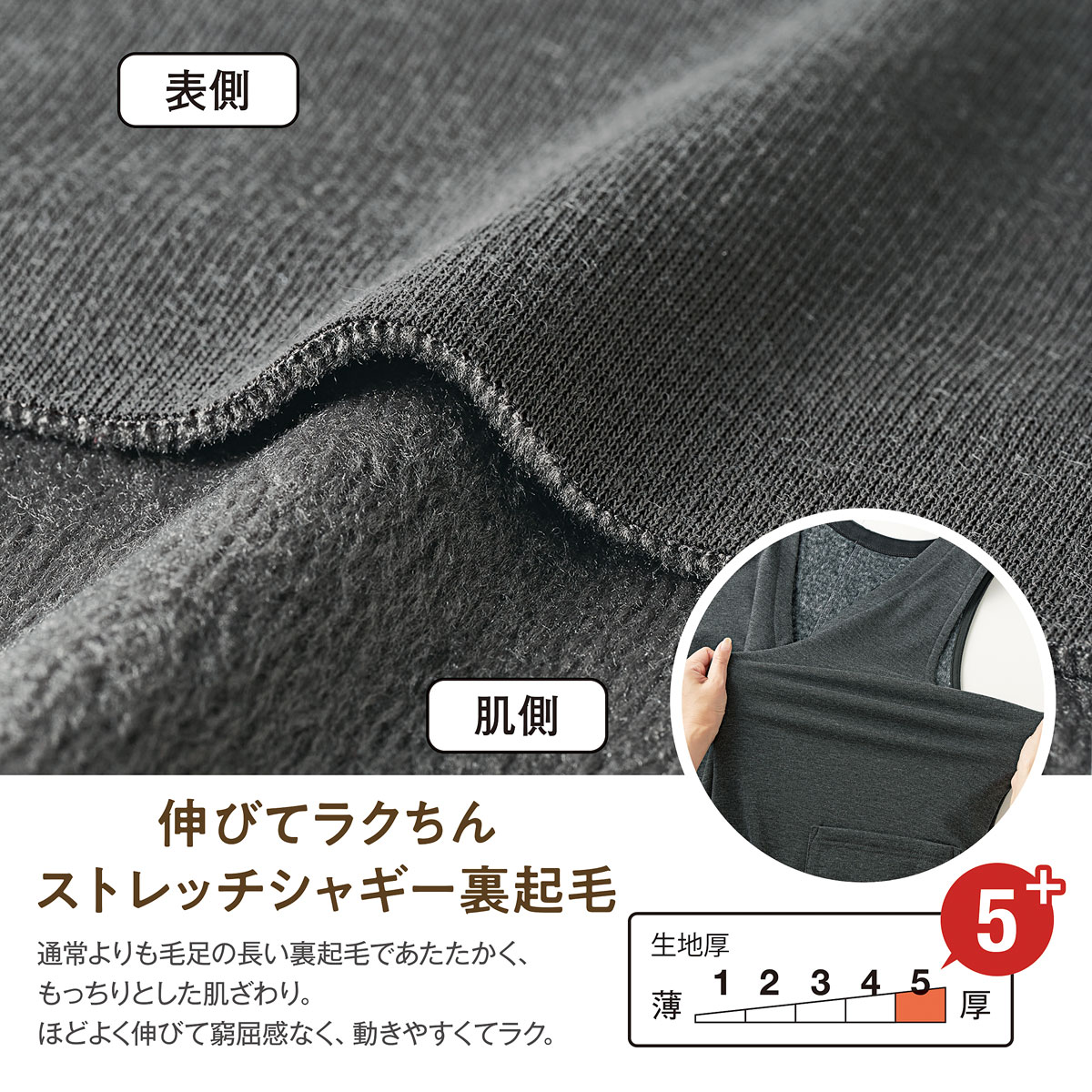 伸びて着心地もラク 通常よりも毛足の長い裏起毛であたたかく、もっちりとした肌ざわり。ほどよく伸びて窮屈感なく、動きやすくてラクラク。 ストレッチ裏起毛