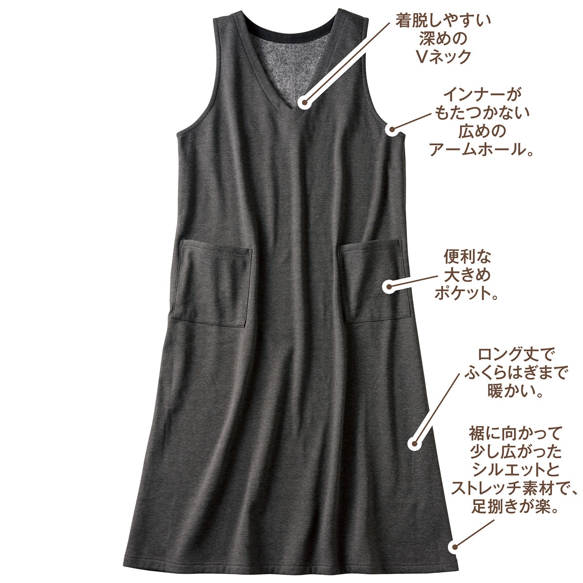 伸縮性があり、着心地もラクなストレッチシャギー裏起毛のジャンパースカート。通常よりも毛足の長い裏起毛であたたかく、もっちりとした肌触りが特長。ほどよく伸びて窮屈感なく、動きやすい。着脱しやすい深めのVネックとインナーがもたつかない広めのアームホール。ロング丈で足元の冷え防止に役立ちます。足さばきがいいよう、裾に向かって少し広がったシルエットで家事にもぴったり♪大きいサイズも展開(M~5L)