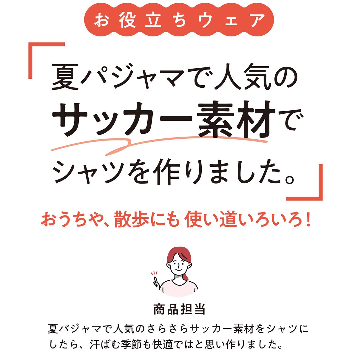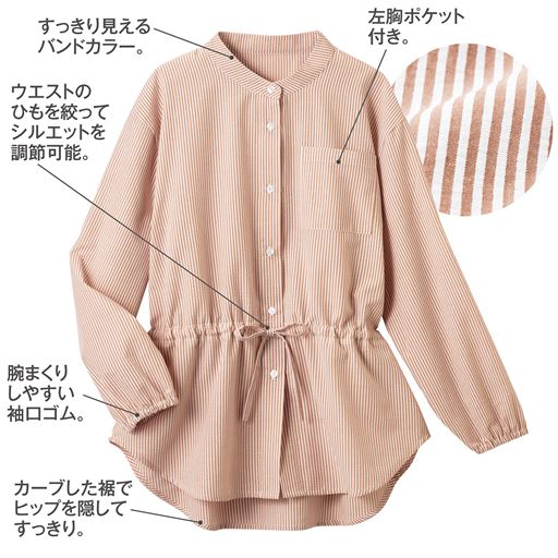 さらりと爽やか、綿混サッカー素材。ポコポコした表面で汗をかいてもさらさら快適。洗濯後も乾きやすくお手入れ楽ちん。バントカラー+カーブした裾ですっきり見せも!袖口ゴム入りで腕まくりしやすいから家事にもおすすめ。ウエストの紐を絞ってシルエットの変化を楽しめます。