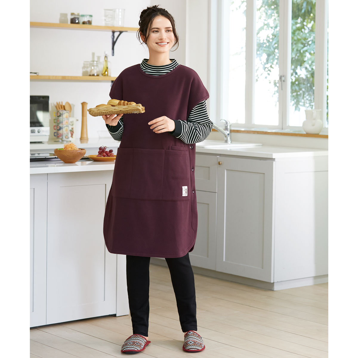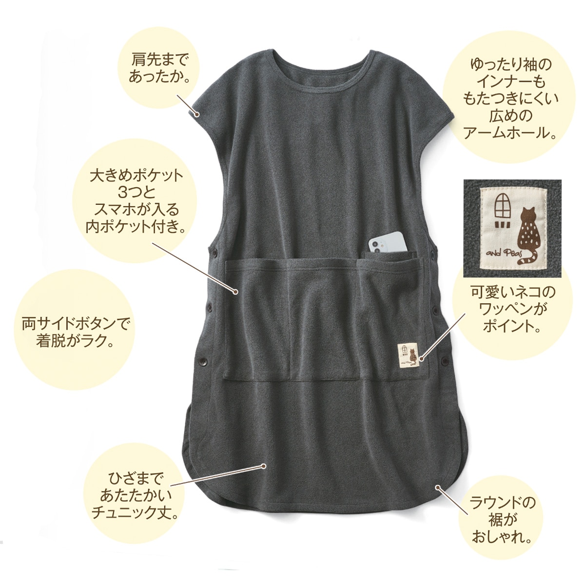 のんびりくつろいだり、家事をしたりのお家時間にぴったりのらくちんチュニック。ふんわりとした手ざわりと軽やかさで、体をあたたかく包み込みます♪洗濯後の乾きが速いのも嬉しいポイント。両サイドはボタン留め仕様で着脱らくちん。便利な3つの大きめポケット+内ポケット付きでエプロンとしてもお使いいただけます。小さいサイズから大きいサイズも展開(S~5L)