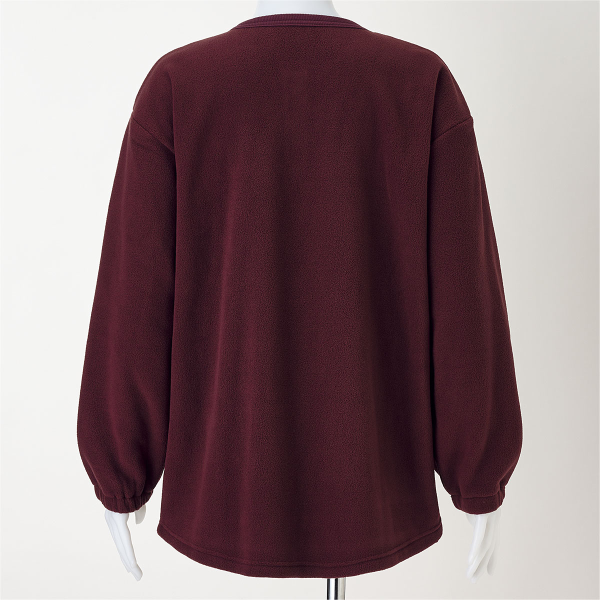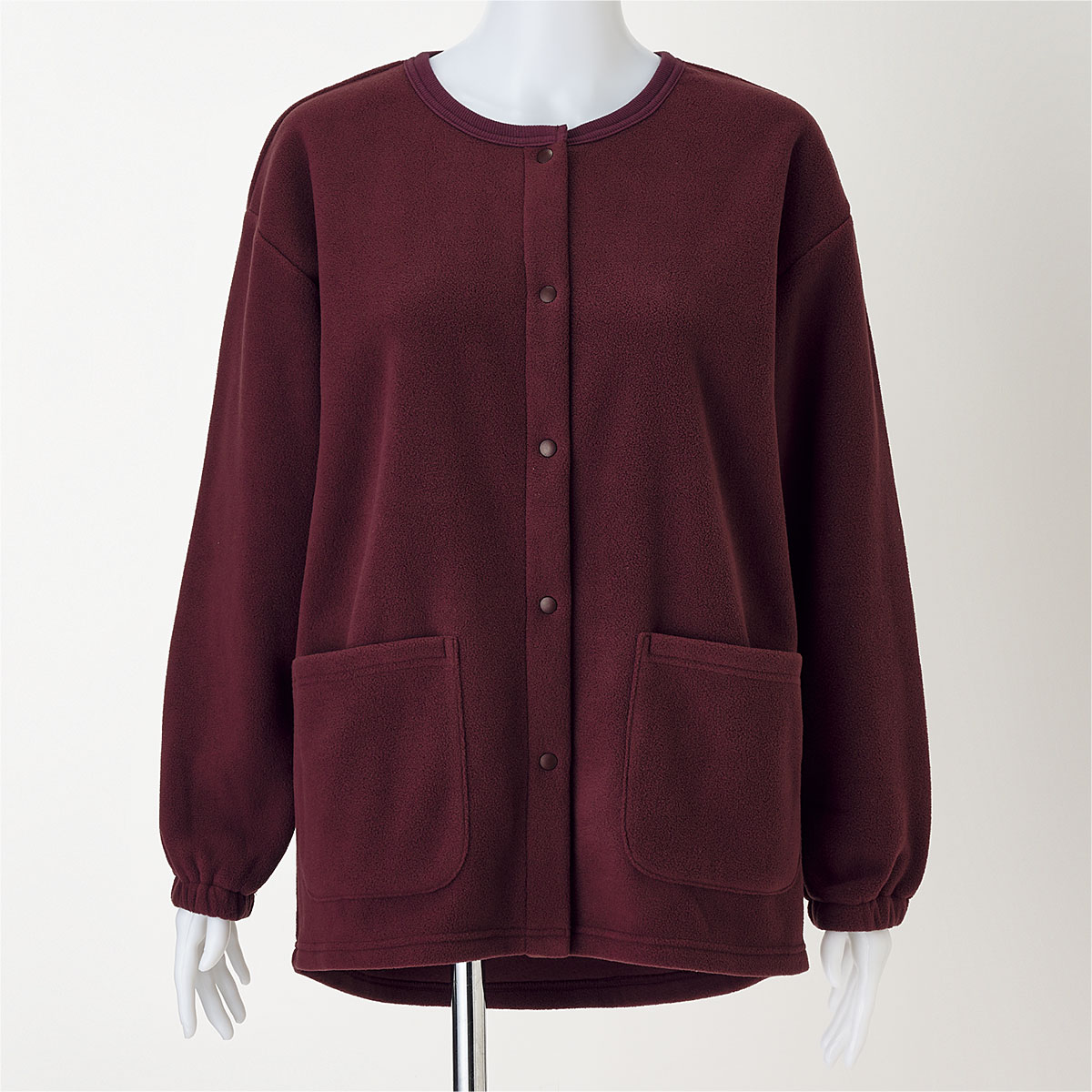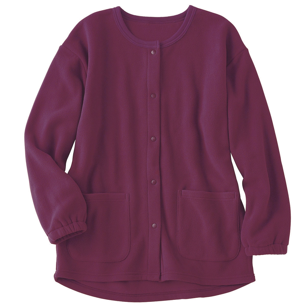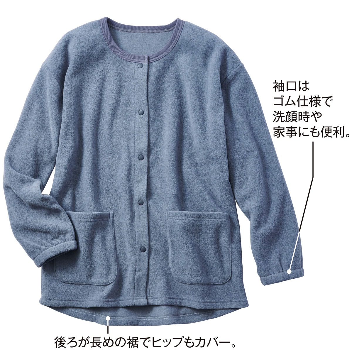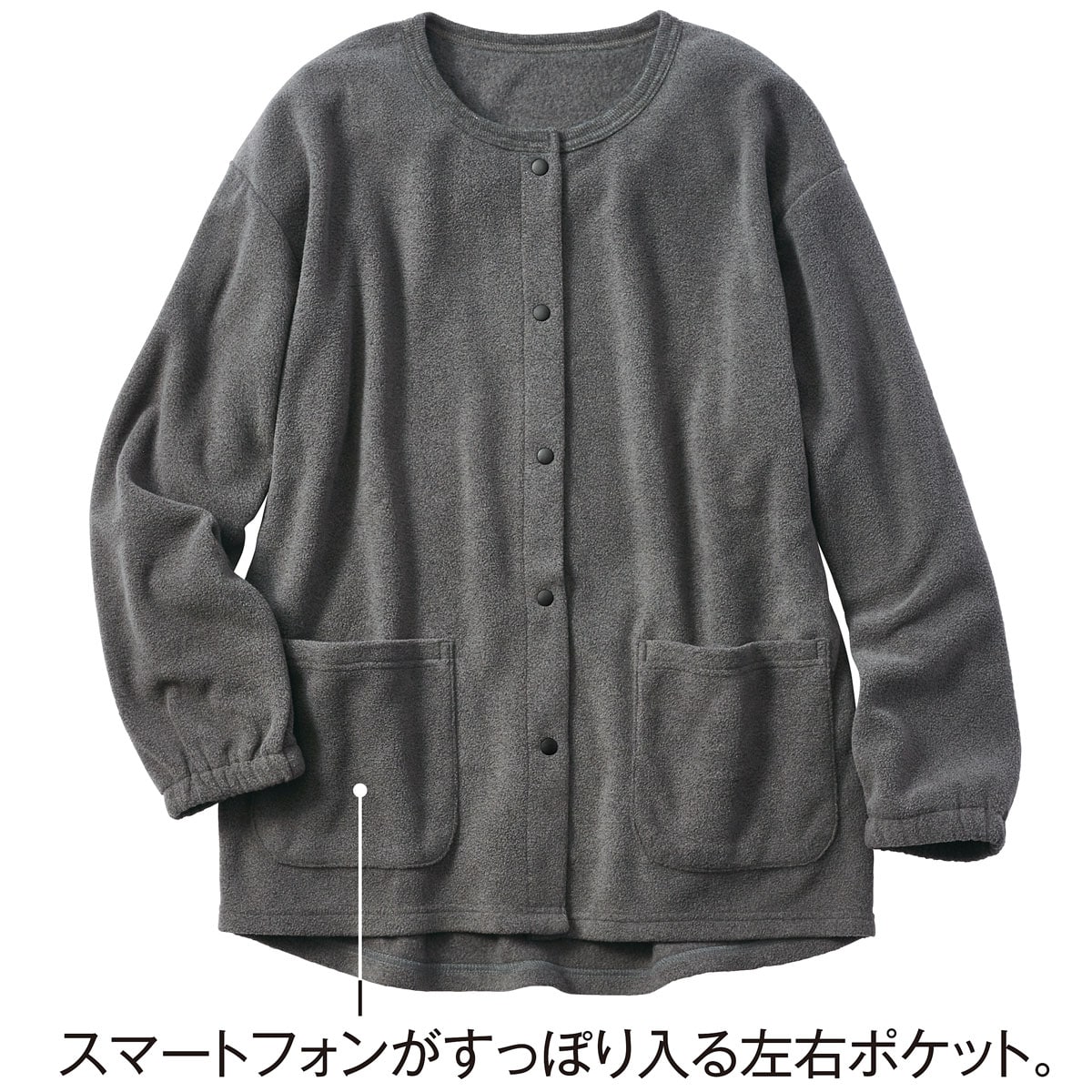 ふわっと軽やかな着心地となめらかな肌ざわりが特長のフリース素材。長めの裾が体を包み込み、ヒップまでカバーします。着脱しやすいスナップボタン仕様。左右には便利な大きめポケット付き。洗濯後の乾きが速くお手入れもラクラク♪大きいサイズも展開(M~5L)袖口は、たくし上げやすいゴム仕様で洗顔時や家事にも便利。