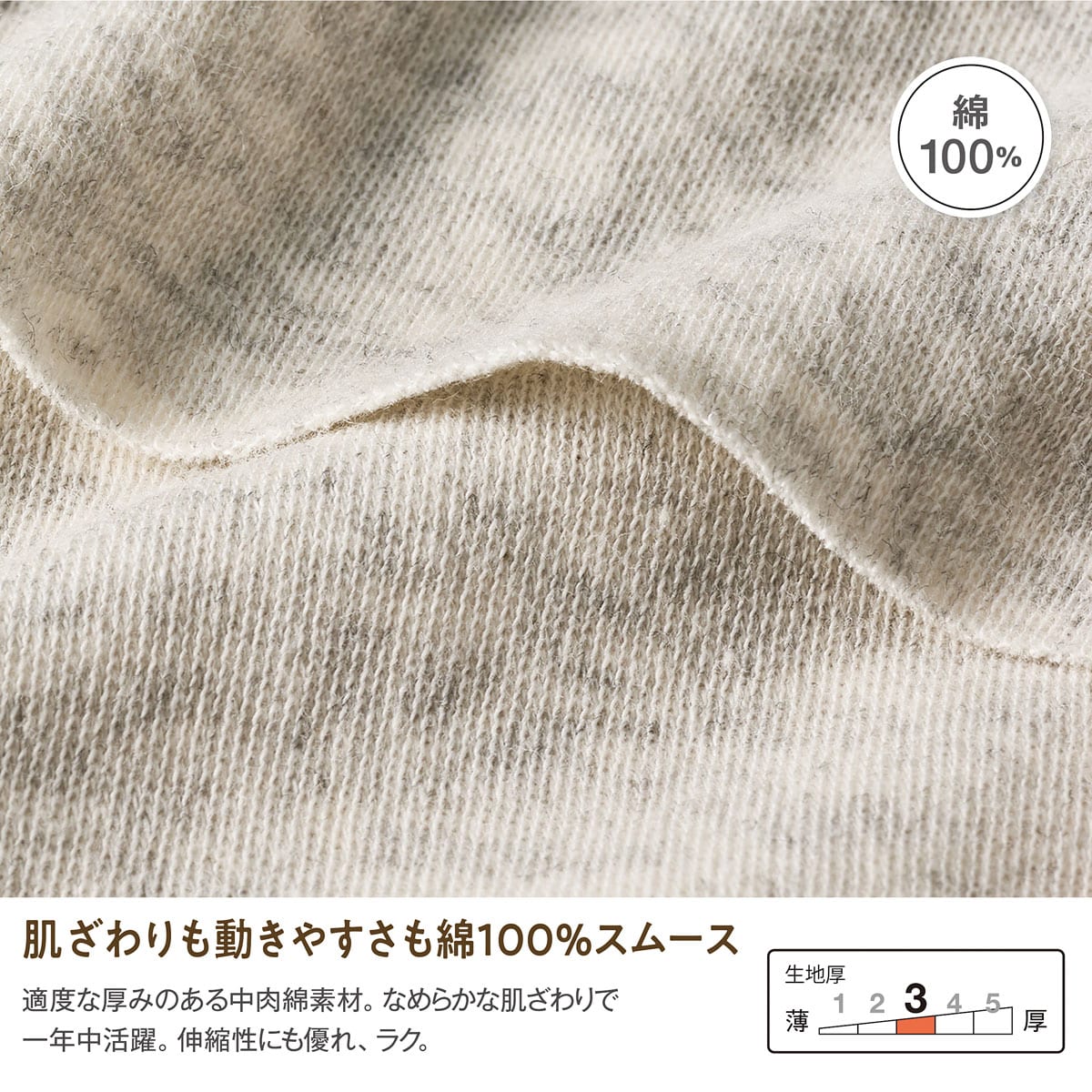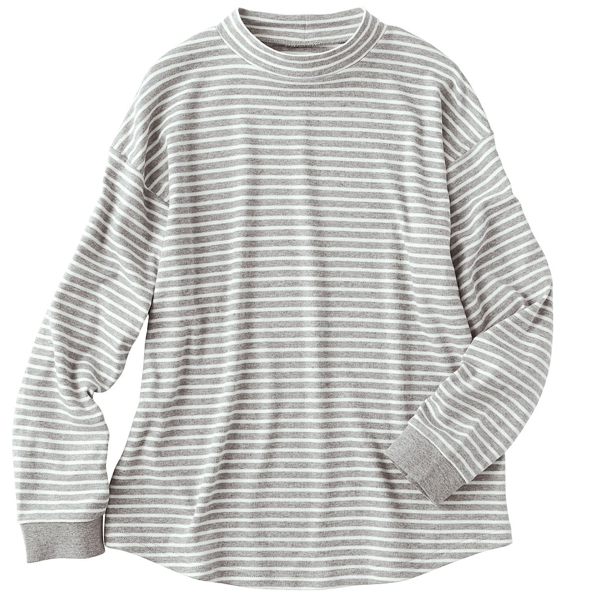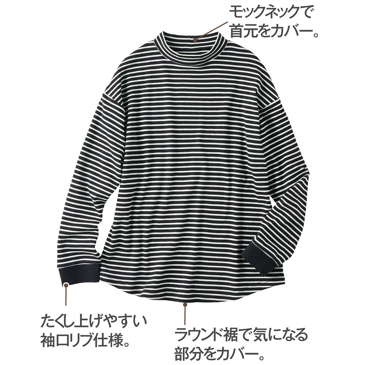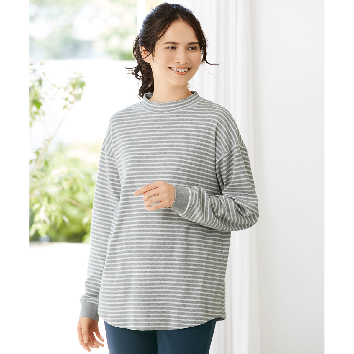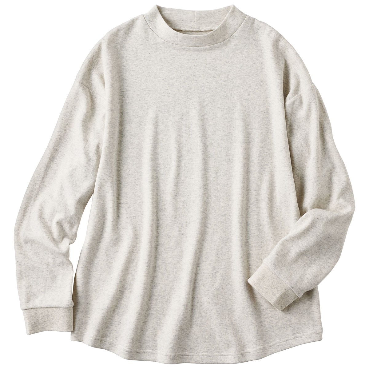 -生地-肌触りのよさと動きやすさを兼ね備えた綿100%のスムース。適度な厚みのある中肉素材で一年中活躍。-デザイン-・モックネックで首元カバー・たくし上げやすい袖口リブ仕様・ラウンド裾で気になる部分をカバー・ゆったりサイズでルームウェアやパジャマとしておすすめ・インナーとしても着まわしやすいので長い時季活躍使いやすさ、肌あたりの良さで人気の定番パンツNI-389と同素材なので、上下で組み合わせて着用するのもおすすめです。大きいサイズまで展開(M~3L)