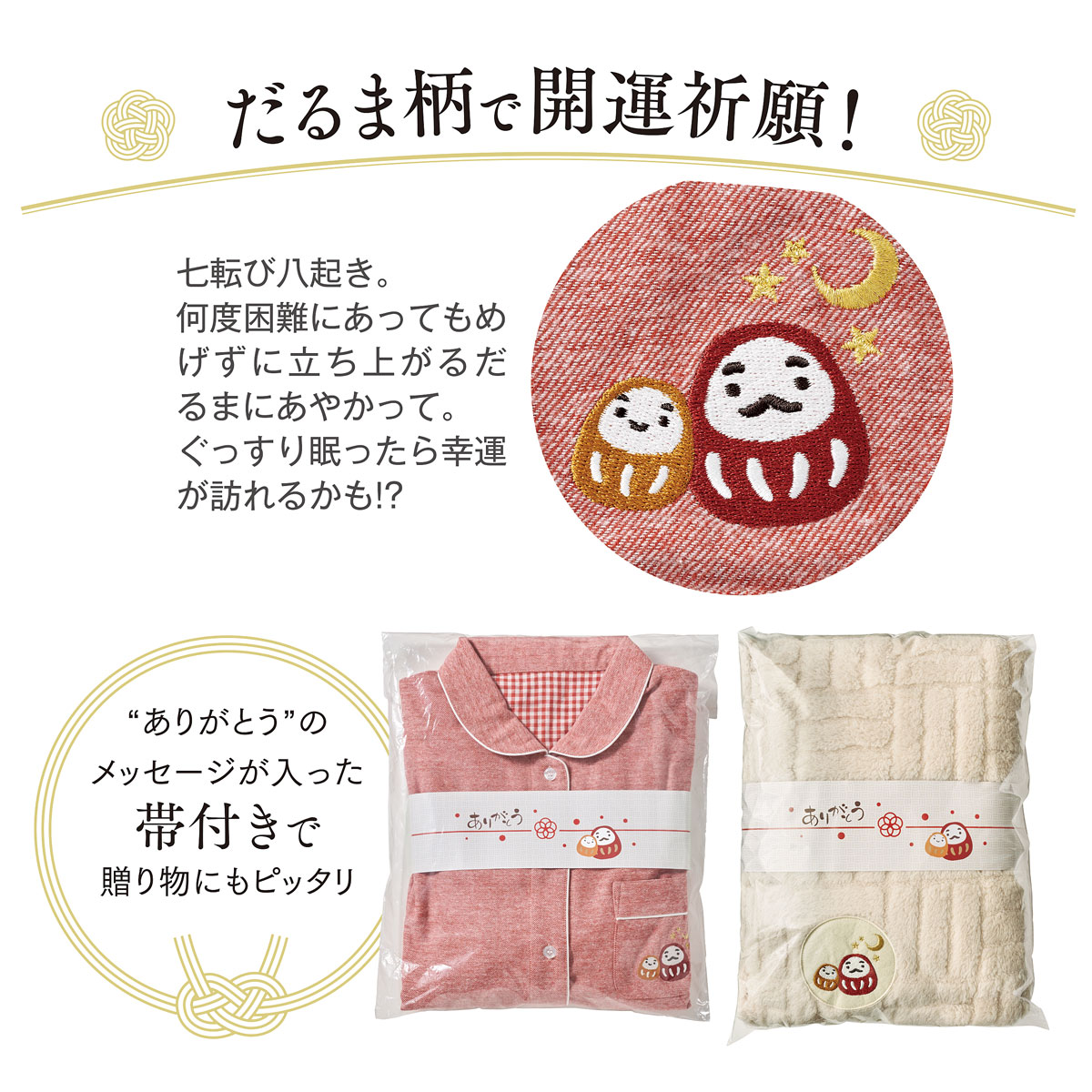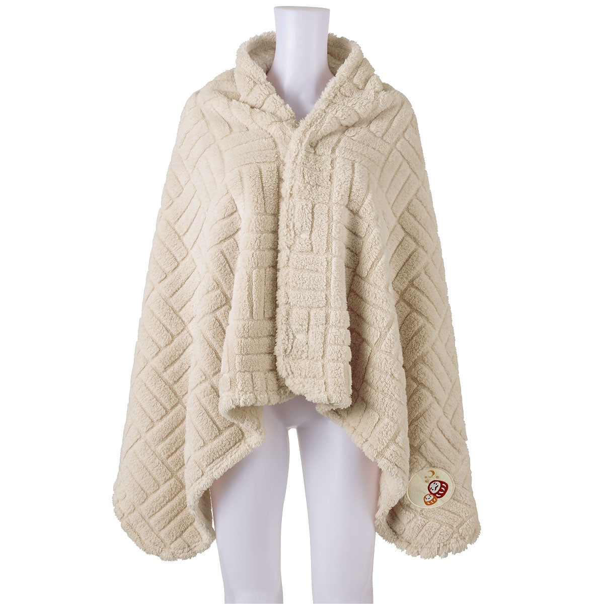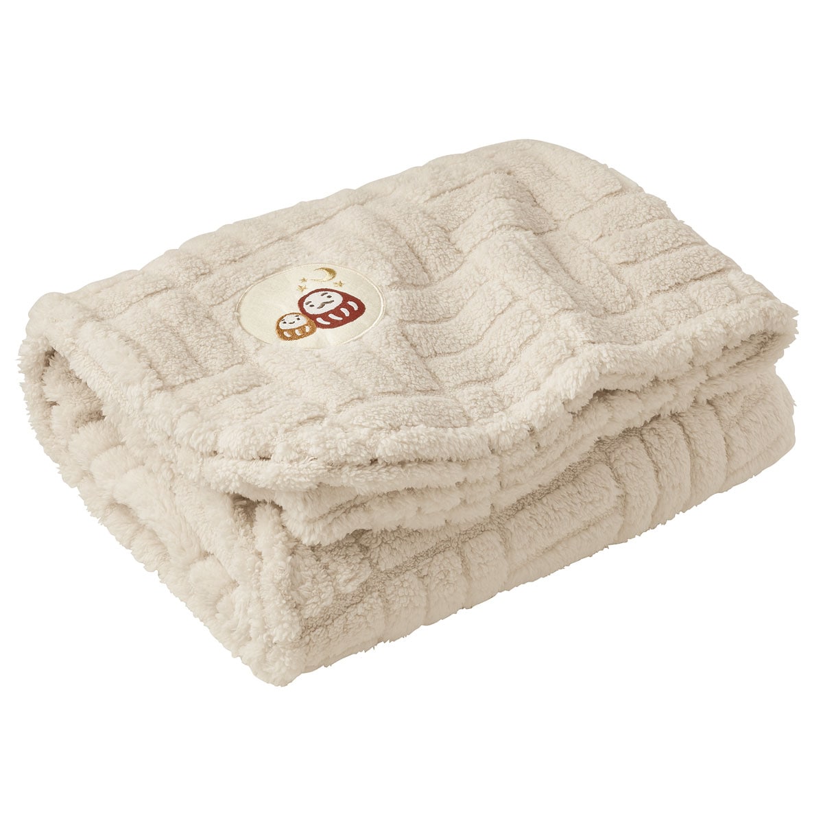 新年特別企画!母娘やお友達と、2026年の幸せをシェアしてほしい、そんな想いでご用意しました。生地は縁起の良い伝統的な和柄である「三崩し」柄のもこもこボアフリース。空気を含んで軽いのに、毛布のようなボリューム感でふんわりあたたか。75cm×150cmの大きめサイズで、スナップボタンを留めればケープ風にもなります。フェルトワッペンに施しただるま刺繍で福を重ねた一枚をくつろぎタイムのお供に。