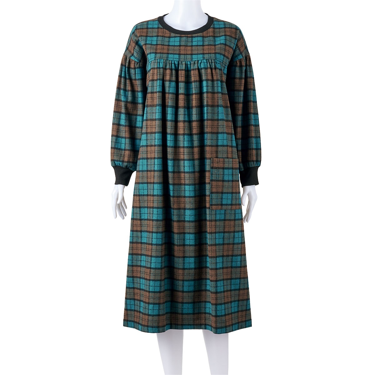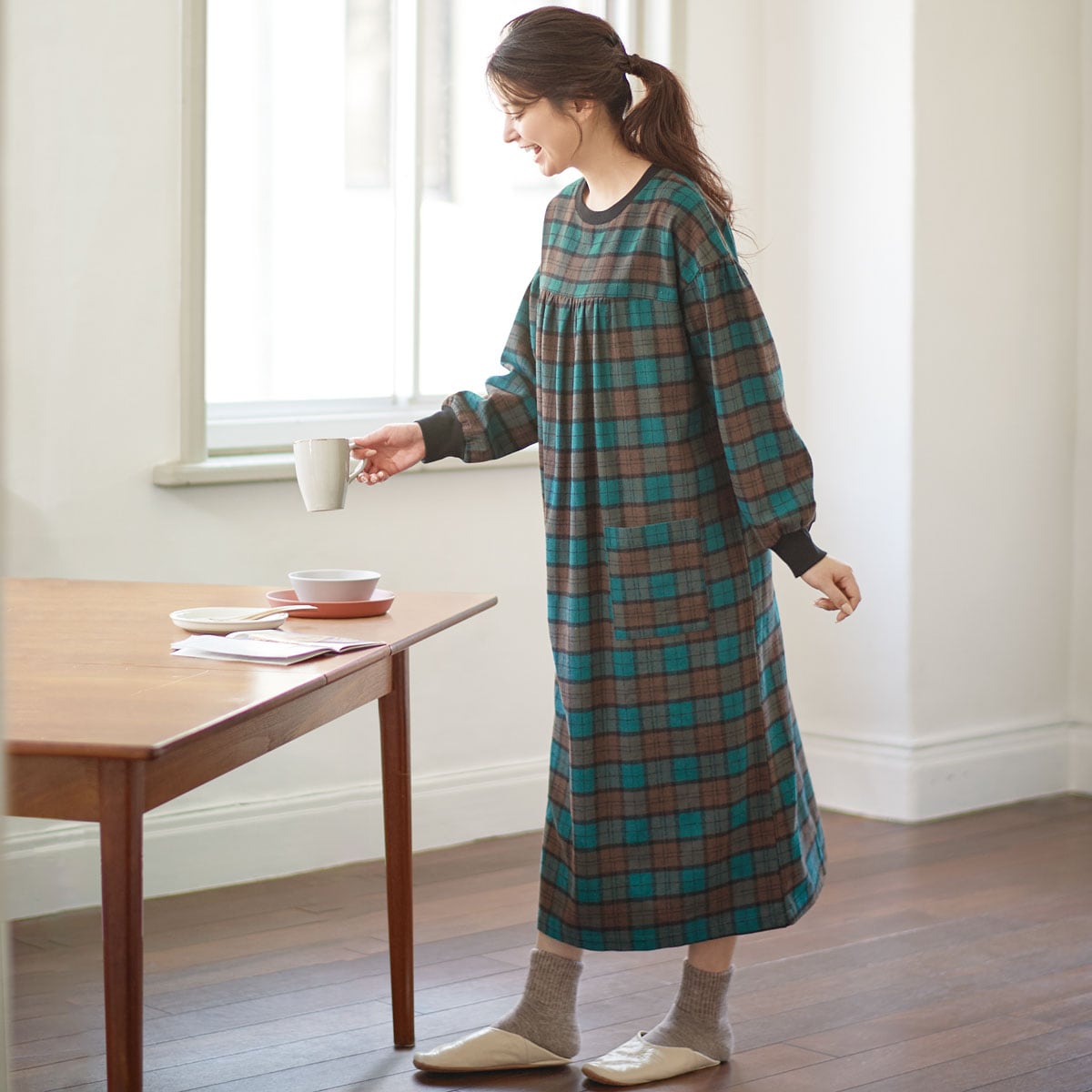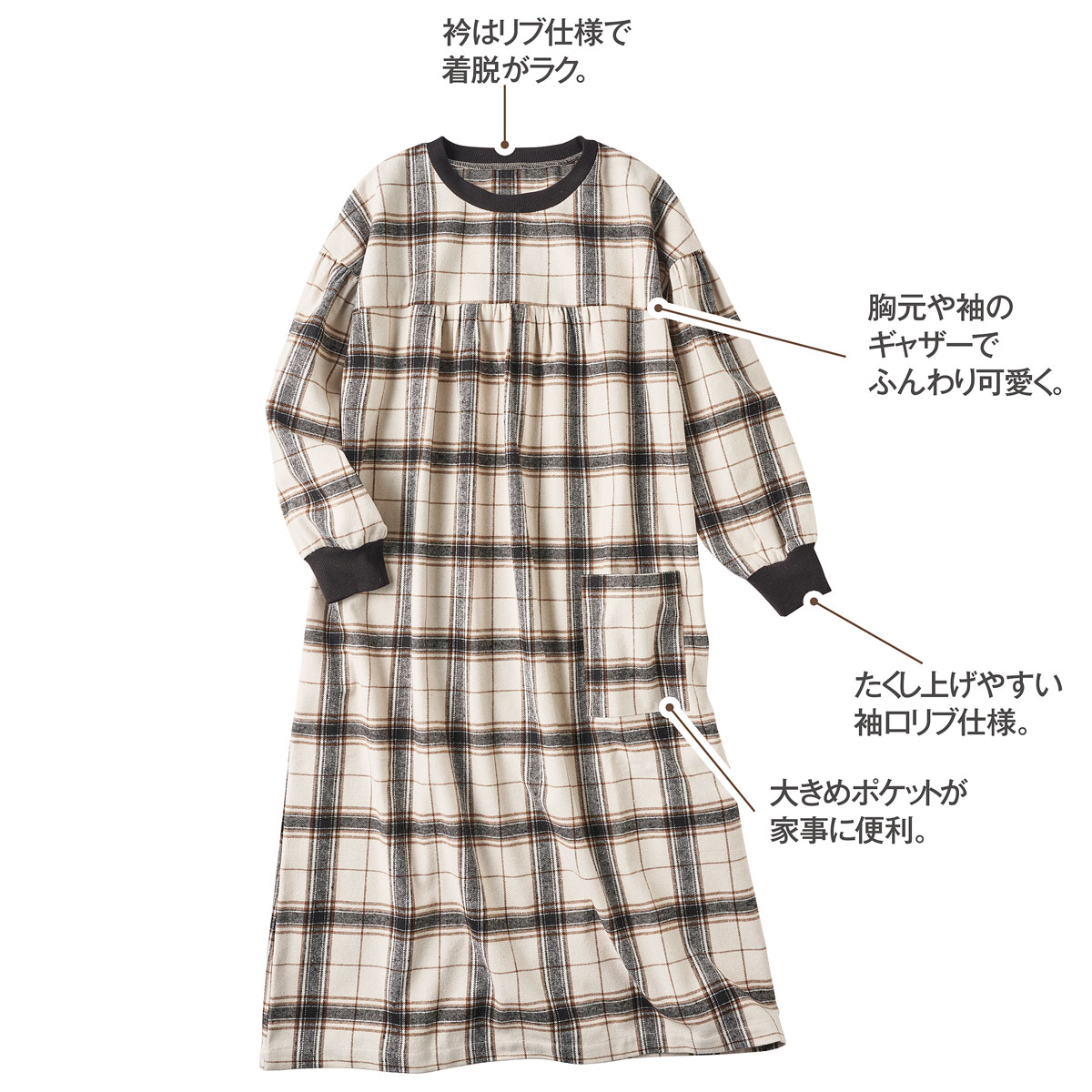 -ポイント-お家でも自分好みのスタイルに。何も考えずにスポンとかぶればラク可愛くてご機嫌な一日に。-デザイン-・衿はリブ仕様で着脱がラク・胸元や袖のギャザーがふんわりかわいい・たくし上げやすく、家事にも便利な袖口リブ仕様・大きめポケットが便利・冬らしいほっこりしたチェック柄-素材特徴-両面起毛でふんわりぬくもり感のある肌触りとハリコシのある素材感を両立。ポリエステル混でシワが気になりにくく、扱いやすい◎廃棄される繊維を再利用した環境にやさしい素材です。